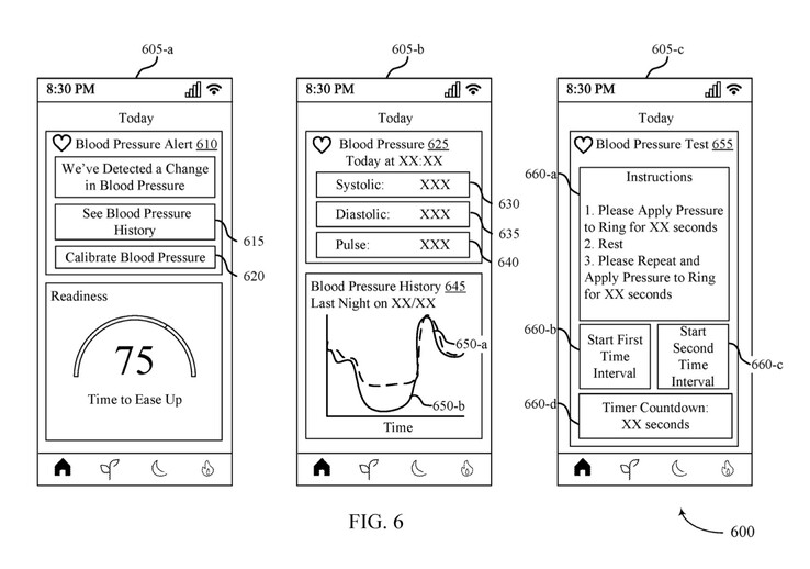 In wezen beschrijft het octrooi een methode voor het meten van de duur van pulsgolven tussen twee punten op het lichaam. Dit is essentieel omdat de bloeddruk wordt bepaald op basis van de tijd die een hartslaggolf nodig heeft om van het ene punt op het lichaam naar het andere te reizen. Aan de hand van het op deze manier bepaalde pulstijdinterval kan Oura de bloeddruk berekenen. Zoals de patenttekeningen laten zien, worden specifieke waarden voor systolische en diastolische bloeddruk weergegeven, in plaats van alleen een ruwe trendlijn, zoals bij sommige concurrerende producten het geval is.