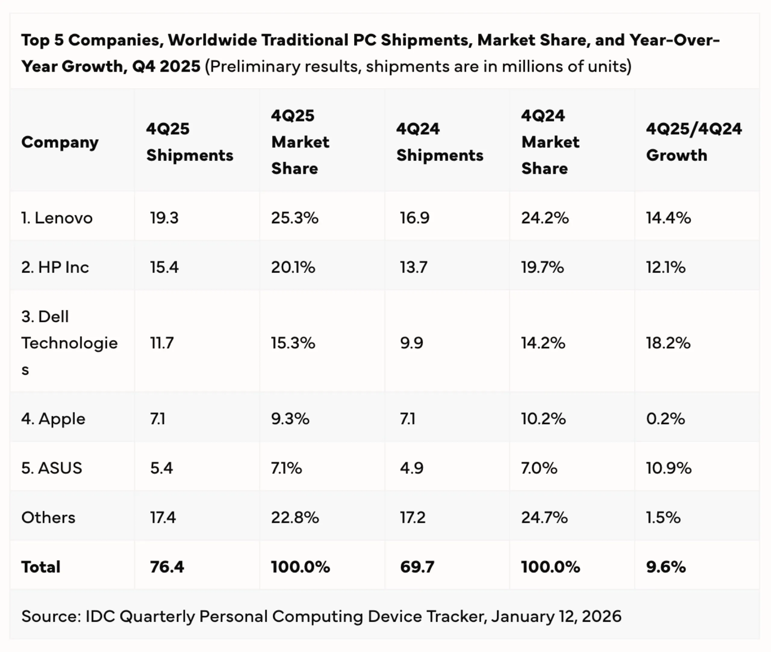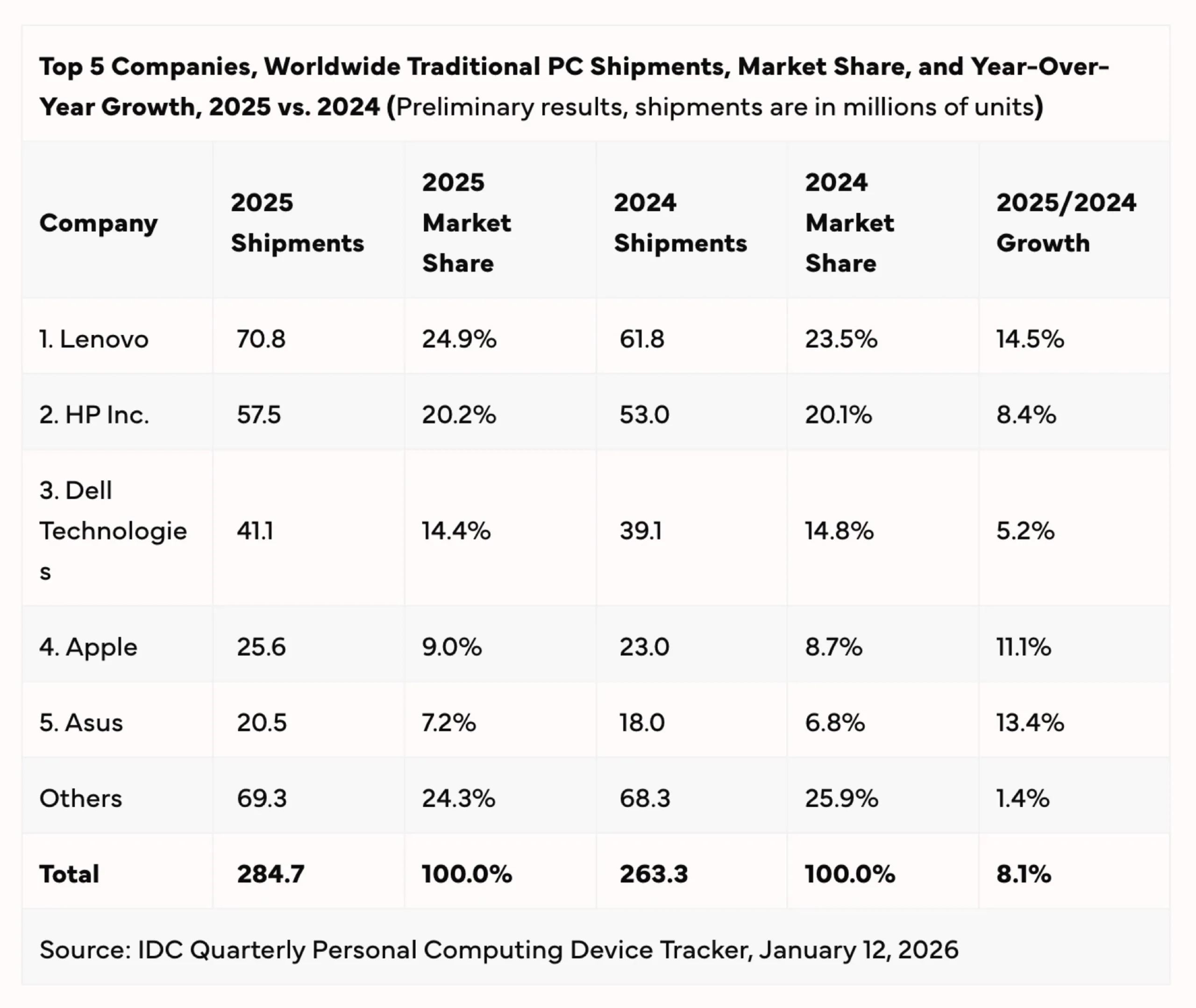 Volgens de laatste gegevens van International Data Corporation (IDC) is de wereldwijde pc-markt in het vierde kwartaal van 2025 met 9,6% gegroeid, met een totale groei van 8,1% voor het hele jaar, tot 284,7 miljoen stuks. Twee factoren zijn voornamelijk verantwoordelijk voor deze groei in de eerste helft van het jaar: het einde van de ondersteuning voor Windows 10, wat veel gebruikers ertoe aanzette om te upgraden naar een nieuwe pc, en de Amerikaanse tarieven, die voor onzekerheid bij de consument zorgden.