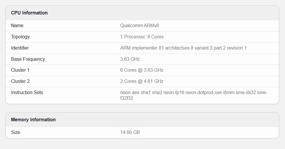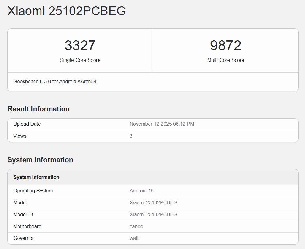 De POCO F8 Ultra verscheen in de Geekbench 6 database en behaalde scores van 3.327 in single-core tests en 9.872 in multi-core tests. Als we in de details graven, bevestigen de codenaam van het moederbord, "Kano", en de kloksnelheden van de CPU (4,61 GHz voor de twee hoofdkernen en 3,63 GHz voor de overige zes) dat het apparaat zal beschikken over de krachtige Snapdragon 8 Elite Gen 5 chip.