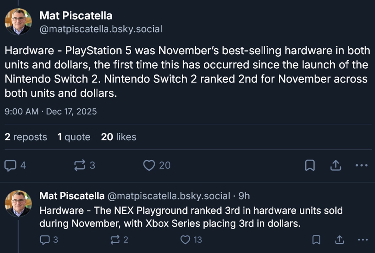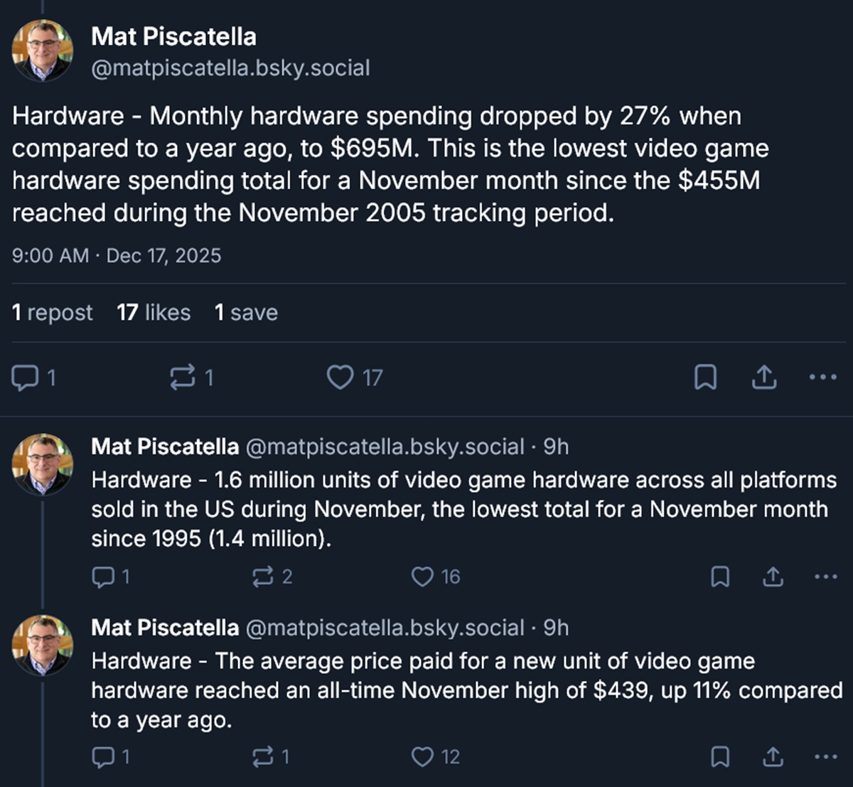 Sony mag dan wel blij zijn met het Circana-rapport, maar er zijn waarschuwingssignalen voor de hardwaremarkt. De totale verkoop daalde met 27% vergeleken met dezelfde periode in 2024. De uitgaven bedroegen $695 miljoen, het laagste novembertotaal sinds 2005. Detailhandelaren verkochten 1,6 miljoen stuks, het slechtste resultaat sinds november 1995.