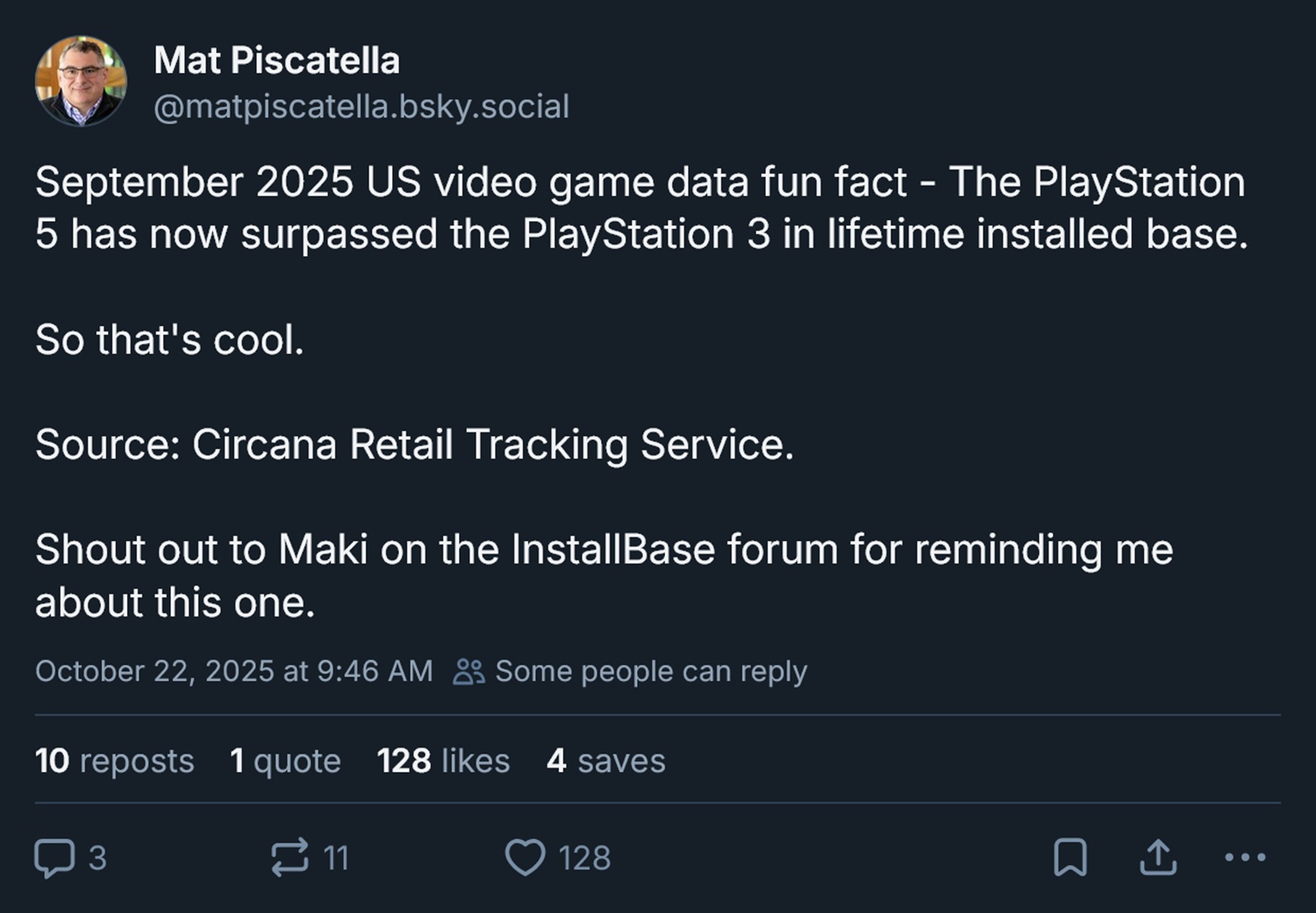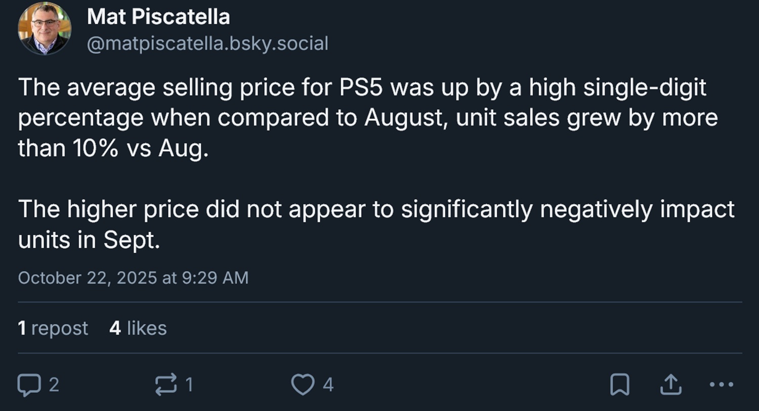 Matt Piscatella heeft het publiek op de hoogte gebracht met een reeks Bluesky-posts. Hij merkt op dat de "gemiddelde verkoopprijs voor PS5 ten opzichte van augustus met een hoog percentage van één cijfer is gestegen". Ondanks de hogere MSRP's steeg de verkoop met meer dan 10% in september.