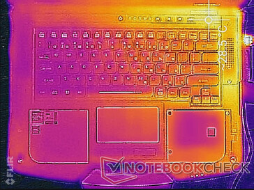 De oppervlaktetemperaturen zijn over het algemeen koel dankzij de CPU uit de Core U-serie en het dikke chassisontwerp. Dit is per slot van rekening dezelfde CPU als in veel dunnere consumentenlaptops. Hete plekken kunnen oplopen tot 29 C en 40 C aan de boven- en onderkant, respectievelijk, na het draaien van zware ladingen gedurende lange perioden.
