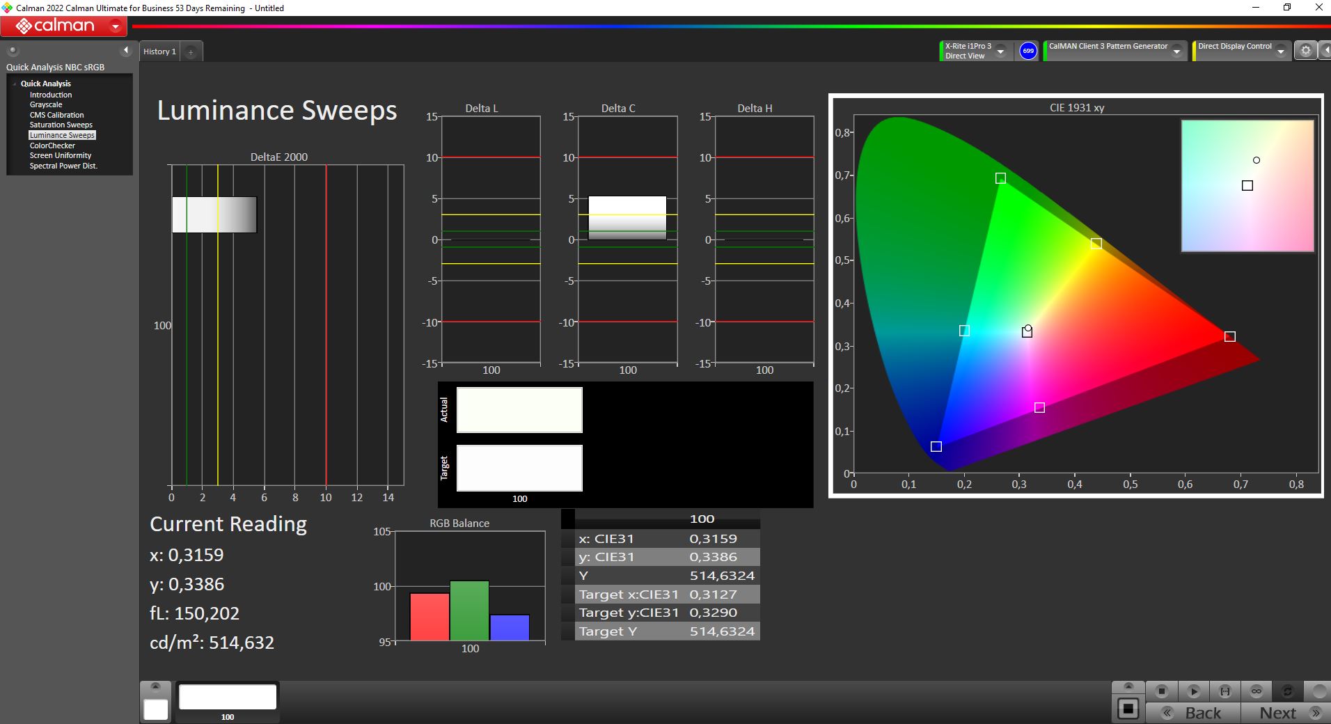 Het scherm is af fabriek gekalibreerd. De DeltaE-waarden voor de grijswaarden en kleuren liggen net boven de 2, maar kunnen bij maximale helderheid niet verder worden verlaagd, zelfs niet door herkalibratie. In de standaardmodus is de helderheid 90 procent, gamma en kleurtemperatuur zijn niet helemaal optimaal. Het verlagen van de helderheid zou verplicht moeten zijn voor makers van inhoud om een nog betere kleurnauwkeurigheid te bereiken.