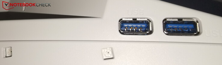 Twee HDMI-poorten (helaas alleen 2.0) evenals een volledige DisplayPort en een USB-C-poort zijn bedoeld voor verbindingen met afspeelapparaten. Er zijn ook vier USB-A poorten en een USB-B poort. Met name de USB-A poorten zitten paarsgewijs erg dicht op elkaar, maar de verdeling is verder in orde. Power Delivery wordt ondersteund met maximaal 90 W.