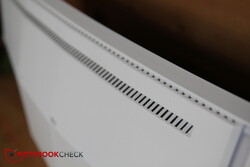 Over het geheel genomen is de achterkant een beetje lomp. De dunne randen aan de boven- en onderkant zijn geslaagd, maar de zilveren plastic balk aan de onderkant niet; die verraadt ook fabricagefouten (kieren). Het witte frame moet zeker suggereren dat de monitor ook geschikt is voor Office en Creators, maar zwarte randen zouden iets voordeliger zijn voor gamen en video's kijken.