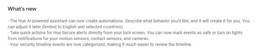 In versie 5.55 voegt Philips Hue verdere verbeteringen toe voor de Hue AI Assistant. U kunt deze nu gebruiken om automatiseringen te maken door het beoogde gedrag aan de bot te beschrijven. De assistent zal de relevante automatisering genereren, die handmatig door de gebruiker kan worden aangepast. Het is goed om te weten dat de Hue AI Assistant alleen beschikbaar is als de app-taal op Engels is ingesteld, en het is nog niet in alle landen beschikbaar.