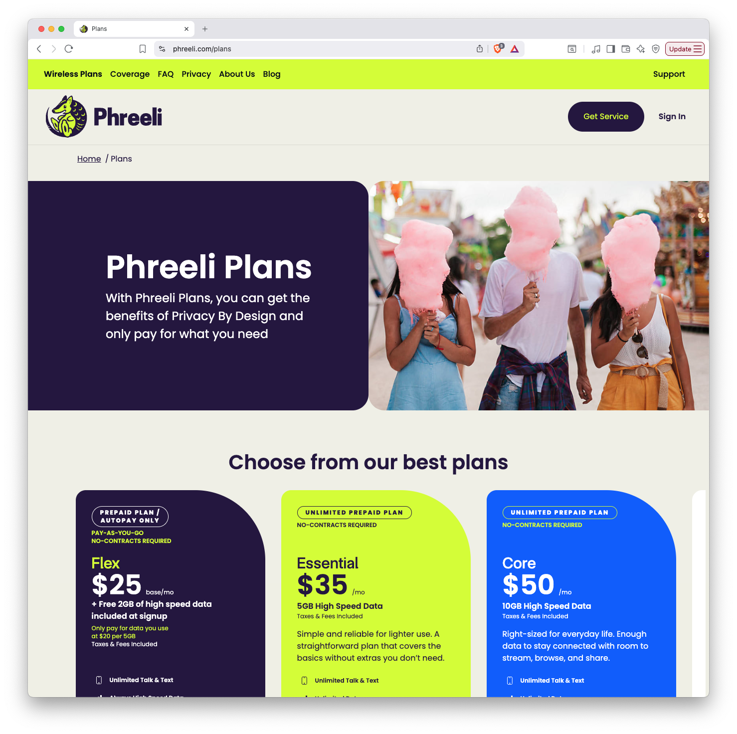 Op dit moment biedt Phreeli vijf abonnementen aan, allemaal met onbeperkt bellen, sms'en, data en hotspotdata, die alleen verschillen in de hoeveelheid toegewezen "High-speed" data. Het goedkoopste plan is een prepaidplan vanaf $25 per maand, waarbij gebruikers $20 per 5 GB aan gegevens betalen, en aan de andere kant is er het "Max"-plan voor $85 per maand met 65 GB aan gegevens met hoge snelheid. Alle plannen bieden ook onbeperkt internationaal bellen en sms'en naar meer dan 90 landen, evenals hetzelfde robuuste privacyprotocol.