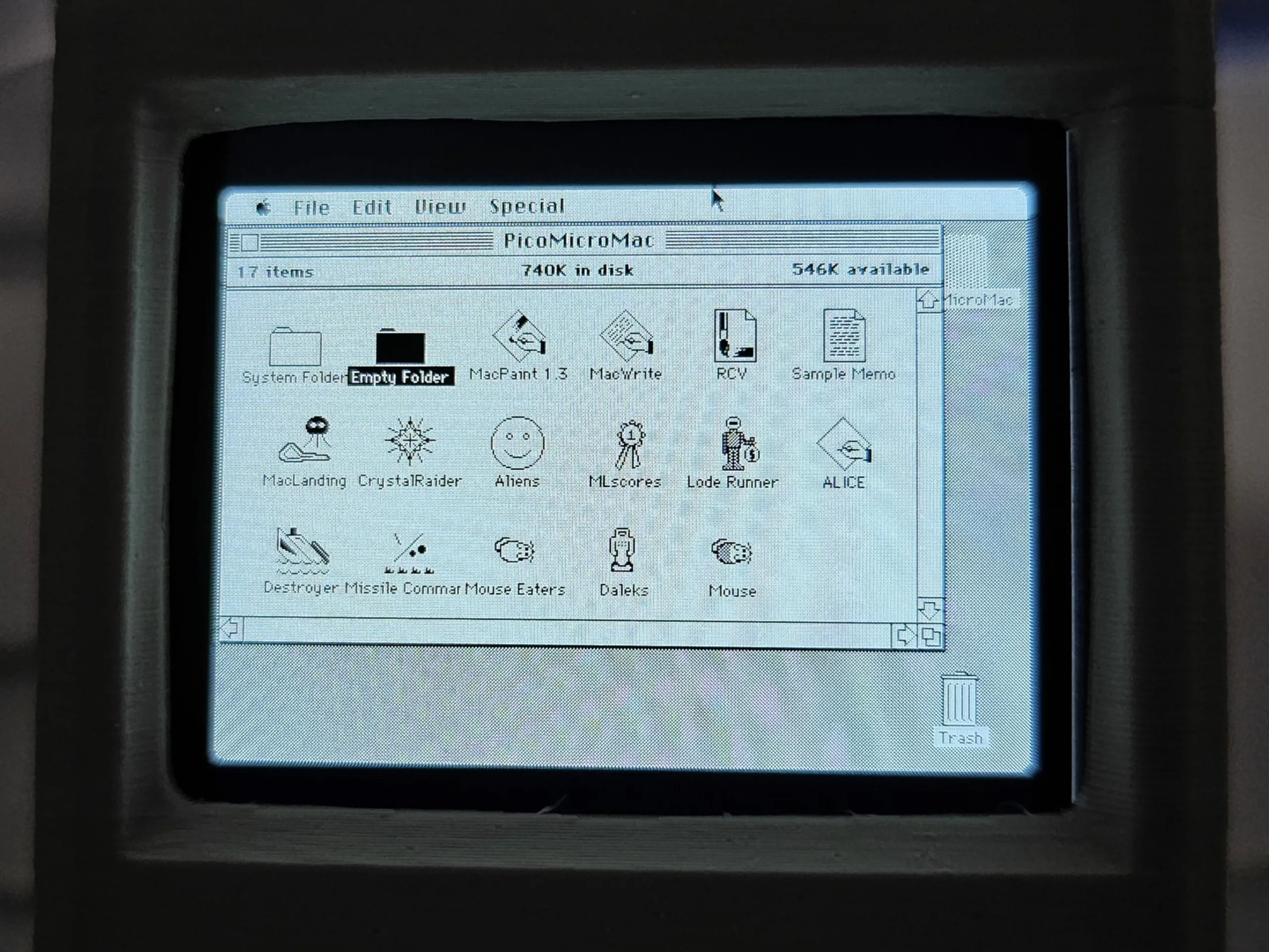 | Aangepaste Raspberry Pi Pico met geflashte firmware en vooraf geïnstalleerde Macintosh System 3.2 opstartschijf |