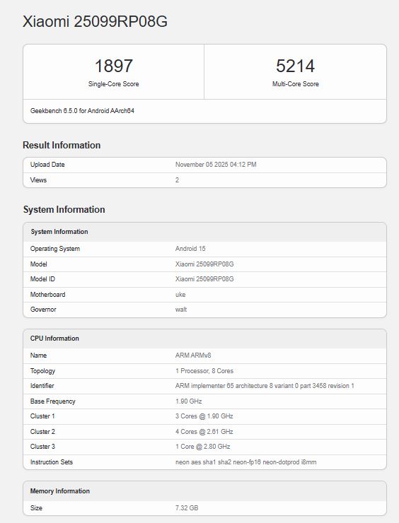 Zoals te zien is op Geekbench, draagt deze nieuwe tablet het modelnummer "25099RP08G" en zou hij volgens de geruchten de Poco Pad X1 gaan heten. Het gerucht over die tablet dook twee maanden geleden, en werd getipt als een rebadge van de Xiaomi Pad 7. De Geekbench notering lijkt dat ook te bevestigen, want het apparaat heeft de Adreno 732-de GPU op de Snapdragon 7+ Gen 3 die ook aan de basis lag van de Xiaomi Pad 7.