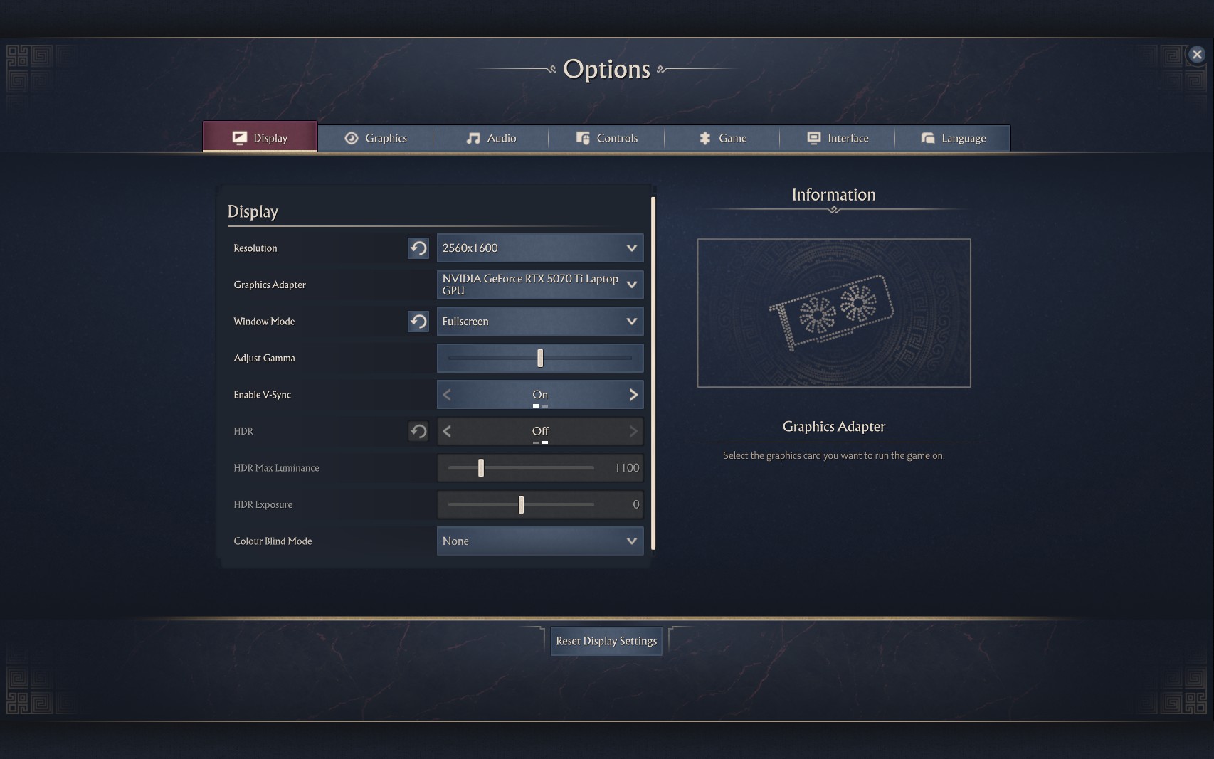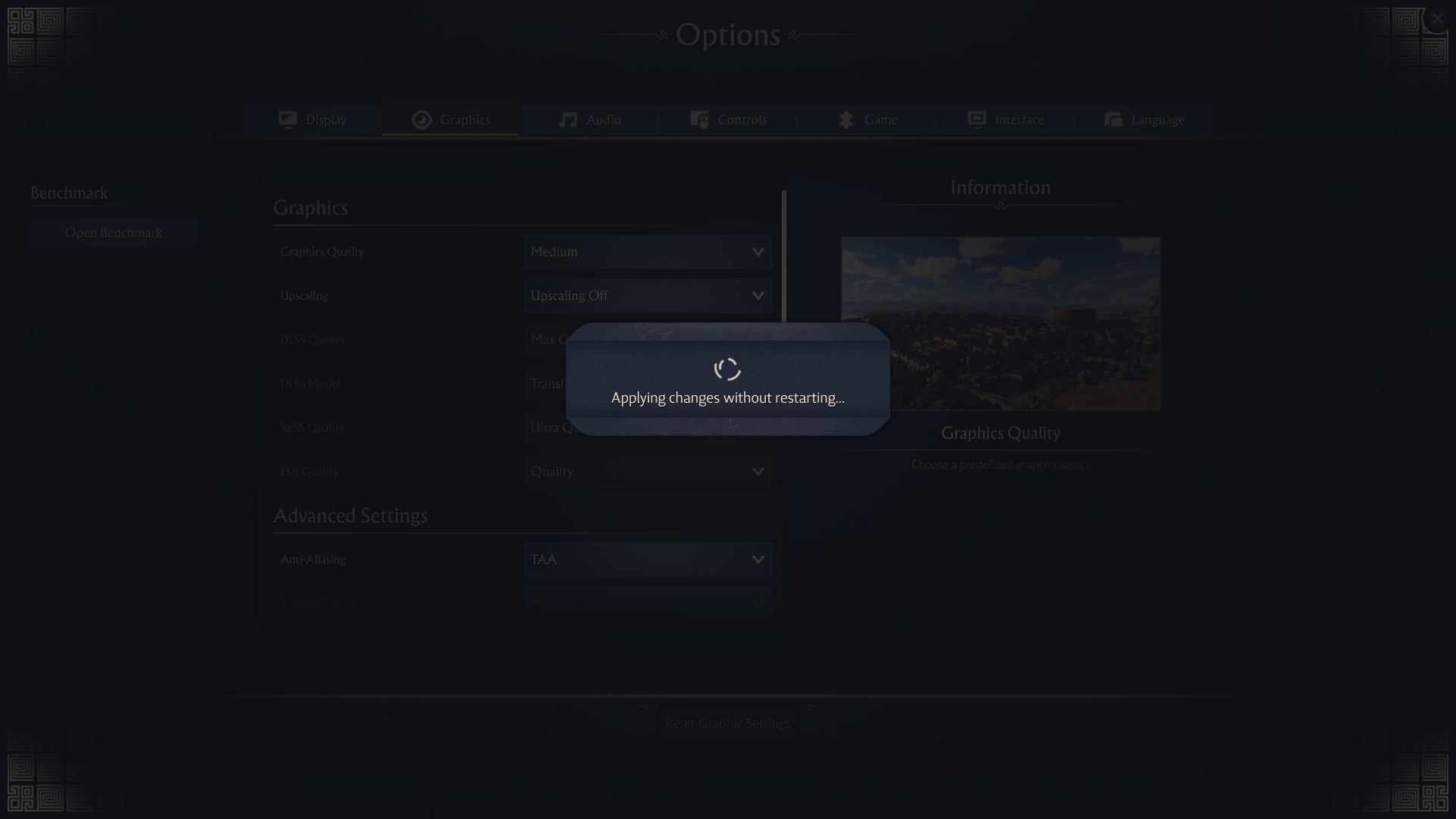 Het uit twee delen bestaande optiemenu (beeldscherm- en grafische instellingen) biedt alle gebruikelijke keuzes en past de wijzigingen gelukkig toe zonder dat u opnieuw hoeft op te starten. Nieuwe instellingen voor de eerste keer toepassen kan echter wat langer duren; in ons geval moesten we tot een minuut wachten.