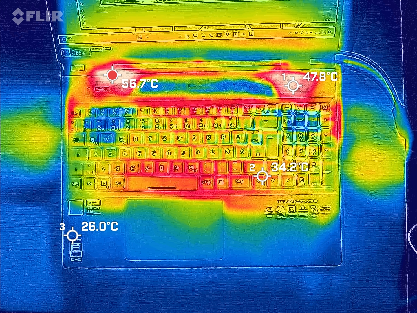 Over het algemeen blijft de gaminglaptop van Acer redelijk koel, met oppervlakken die meestal slechts 25 tot 35 °C bereiken bij volledige belasting. We hebben echter enkele hotspots opgemerkt met temperaturen tot 56 °C: links boven het toetsenbord en aan de achterkant in het midden bovenaan. Dit laatste kan oncomfortabel worden als u bijvoorbeeld met de laptop op schoot aan het gamen bent.