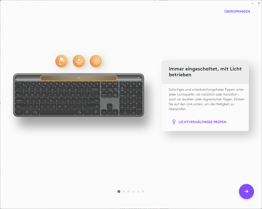 Naast het toetsenbord zelf bevat de verpakking een beknopte gebruikershandleiding. De verpakking is minimalistisch en bestaat grotendeels uit gerecycled materiaal, wat in lijn is met Logitechs streven naar duurzaamheid. De zonnetechnologie is bijzonder opmerkelijk: Het toetsenbord heeft een geïntegreerde zonnecel die zowel door natuurlijk als kunstmatig licht (minstens 200 lux) kan worden opgeladen. Dit betekent dat een externe stroombron meestal niet nodig is, waardoor de impact op het milieu nog kleiner wordt. Volgens de fabrikant is slechts één uur zonlicht voldoende om het toetsenbord enkele weken van stroom te voorzien.
