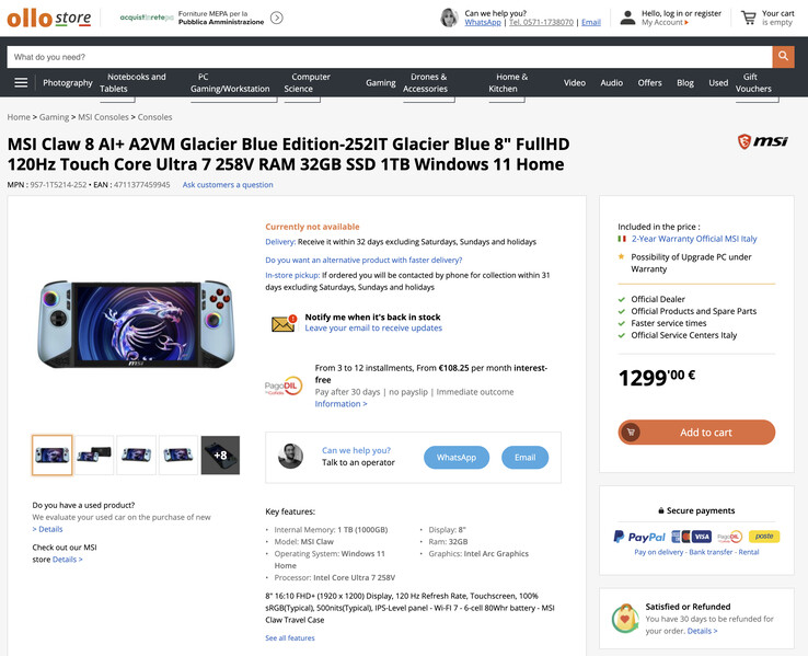 Zoals de screenshot hieronder laat zien, heeft Ollo Store de Glacier Blue Edition geprijsd op €1.299 (~$1.520) met dezelfde Core Ultra 7 258V processor, 32 GB RAM en 1 TB opslag als de Sandstorm-variant die we vorig jaar hebben besproken. Ter informatie: deze laatste wordt momenteel in Italië verkocht voor € 1.049 (~$ 1.229). Helaas heeft MSI niet aangegeven dat het deze Glacier Blue zijplaten afzonderlijk zal verkopen. Meer details over de Glacier Blue Edition kunt u vinden op de wereldwijde website van MSI.