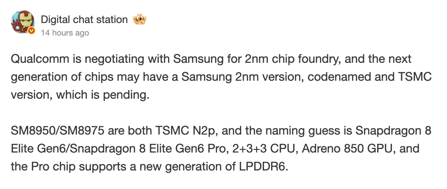 Blijkbaar blijven de SM8950- en SM8975-varianten op schema als de Snapdragon 8 Elite Gen 6 en Snapdragon 8 Elite Gen 6 Pro ondersteund door N2P nodes. Concrete details over deze mysterieuze Samsung Foundry-variant zullen dus waarschijnlijk later verschijnen onder een geheel andere codenaam. Overigens is het mogelijk dat deze samenwerking tussen Qualcomm en Samsung Foundry deze generatie zijn vruchten afwerpt met een nieuwe Snapdragon 8 Elite Gen 5-variant voor Samsung's aankomende opvouwbare toestellen.
