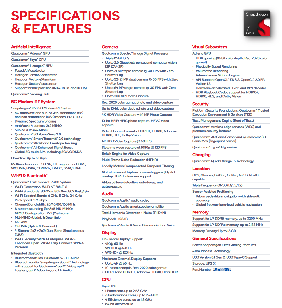 De chipmaker beweert dat de Snapdragon 7 Gen 3 15% sneller is dan de Snapdragon 7 Gen 1 in CPU en 50% sneller in GPU, terwijl hij 20% energiezuiniger is. Vreemd genoeg wordt er een Adreno 720 GPU gebruikt in plaats van een Adreno 725 die te vinden is op de Snapdragon 7+ Gen 2. Zoals altijd heeft Qualcomm de kloksnelheid niet gespecificeerd, maar ervoor gekozen om zich meer te richten op de Snapdragon Super Resolution AI upscaling-technologie voor games.