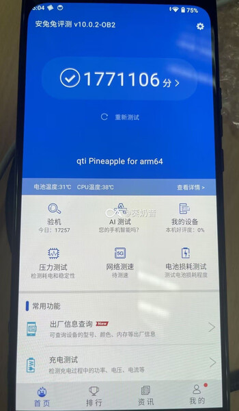Zoals de afbeelding hieronder laat zien, zit de SoC in een Qualcomm-testapparaat met de codenaam 'qti Pineapple for arm64'. Het gerucht gaat dat Qualcomm de Snapdragon 8 Gen 3 heeft ontworpen met een enkele Cortex-X4 CPU-kern, plus drie Cortex-A720-kernen, nog eens twee Cortex-A720-kernen en twee Cortex-A520-kernen die er zijn voor energiezuinige doeleinden. Vermoedelijk is de Snapdragon 8 Gen 3 in staat om meer dan 1.700.000 punten te halen in AnTuTu v10, met 1.771.106 getoonde punten. Helaas zijn de scores uit de oudere AnTuTu v9 benchmark niet direct vergelijkbaar met die uit AnTuTu v10 met die behaald in AnTuTu v10.