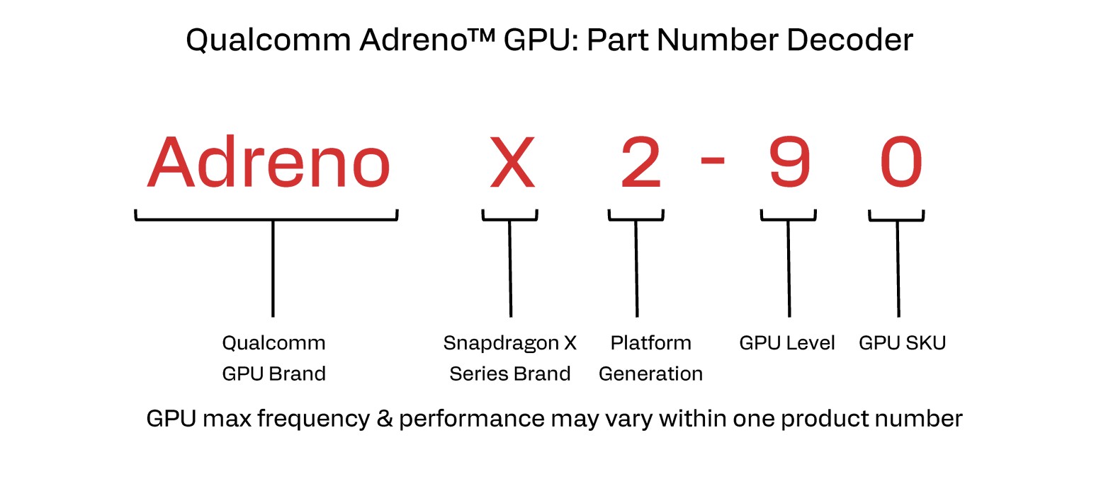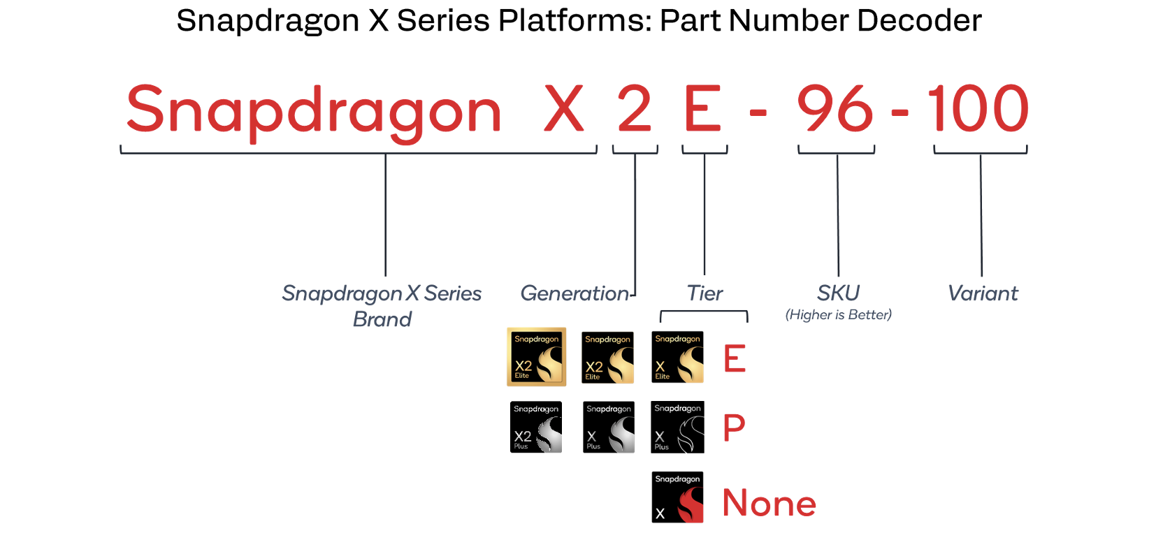 Gezien het aantal beschikbare processors (zie onderstaande tabel) kan deze nomenclatuur snel verwarrend worden en dat is niet ideaal voor klanten. Naast de X2 Elite en X2 Elite Extreme modellen, lanceert Qualcomm ook twee X2 Plus modellen voor apparaten in het lagere segment. Zoals altijd zullen de prestaties van de chips ook variëren tussen verschillende apparaten vanwege verschillende vermogenslimieten. Daarnaast variëren de GPU-klokken opnieuw afhankelijk van het CPU-model, dus zelfs als de twee GPU's dezelfde naam hebben (zoals Adreno X2-90), kunnen de klokken en dus de prestaties merkbaar verschillen.