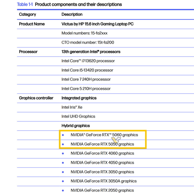Op CES 2025 toonde Nvidia alleen het topsegment van zijn RTX 50-serie grafische kaarten voor laptops, waaronder de GeForce RTX 5090, RTX 5080, RTX 5070 Ti en RTX 5070. Dit laat mogelijk ruimte over voor de RTX 5060 Ti, RTX 5060 en RTX 5050. Hoewel de eerste onbevestigd blijft, heeft Videocardz de overige modellen gespot op de website van HP.
