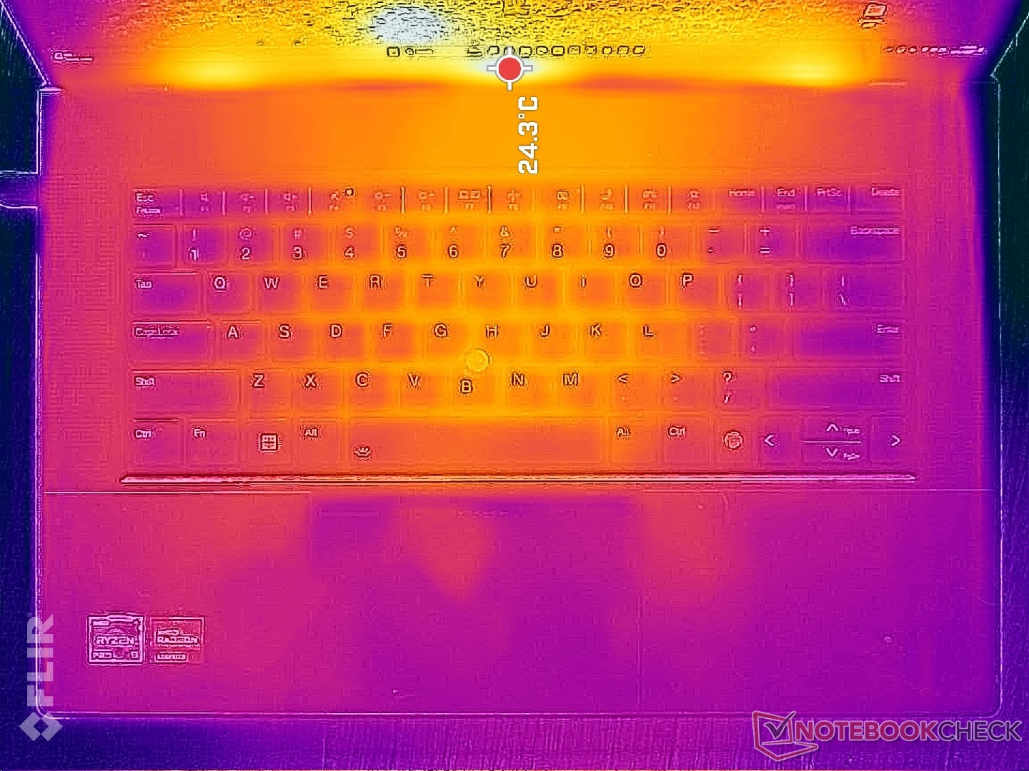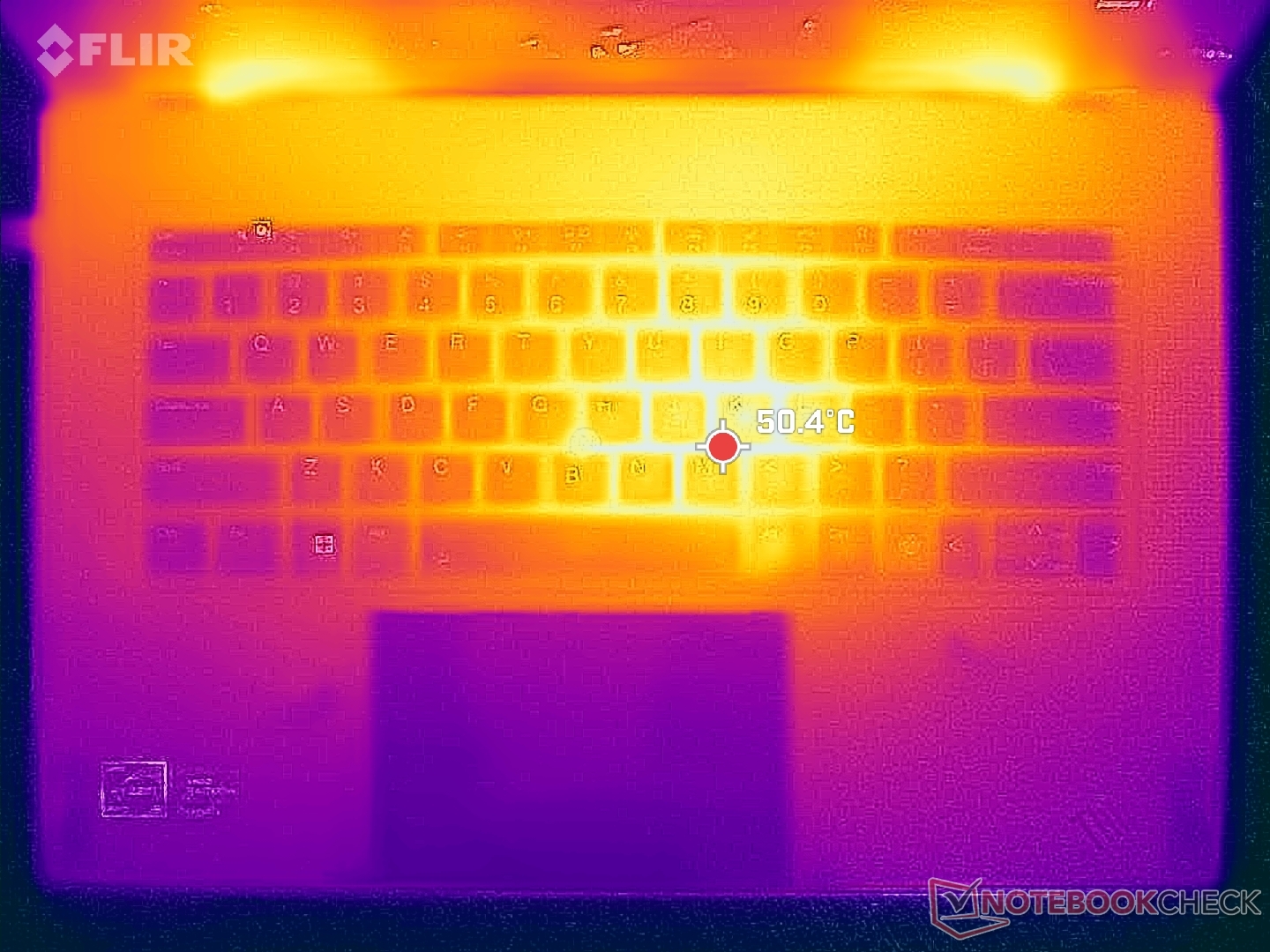 De oppervlaktetemperaturen stijgen en dalen vrij snel en met grotere extremen, aangezien het grootste deel van de behuizing van metaal is. Bij het uitvoeren van veeleisende belastingen zoals games, kunnen hete plekken wel 47 C en 43 C warm worden op respectievelijk het midden en de bodemplaat van het toetsenbord, maar dit kan nog warmer worden tot meer dan 50 C afhankelijk van de omgevingstemperatuur, zoals we hebben waargenomen op de ThinkPad Z16 Gen 1. De resultaten zijn desalniettemin veel koeler dan wat we hebben gemeten op de MSI Creator Z16P die veel te heet zou worden voor zijn eigen bestwil.