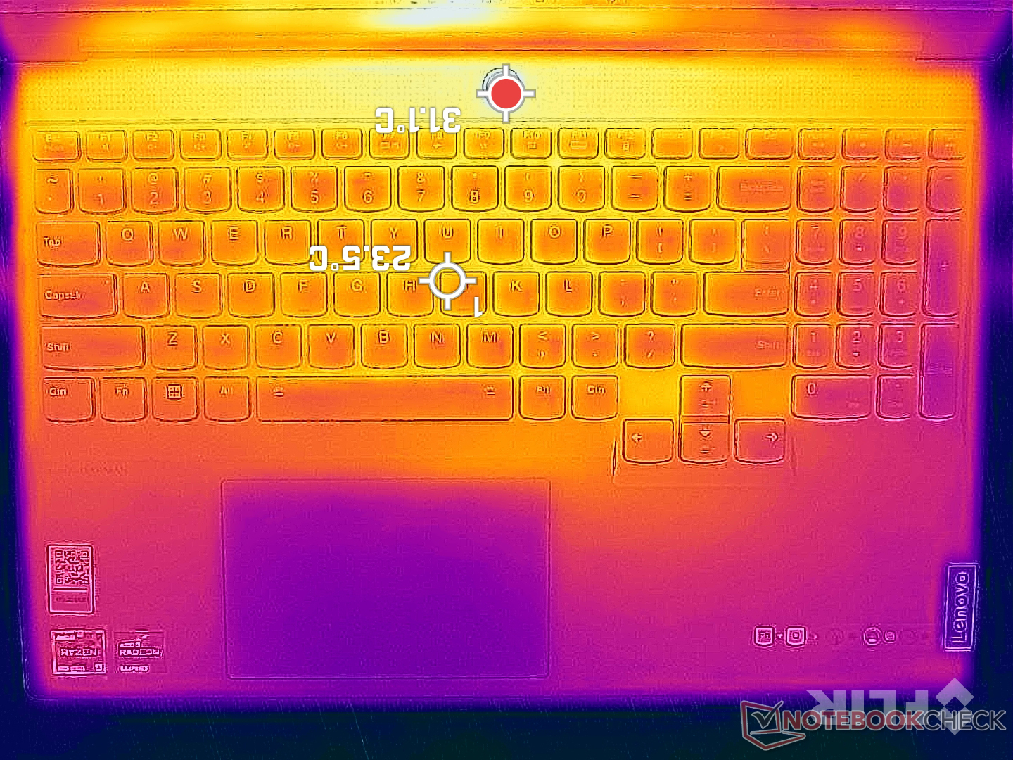 Hete plekken in de oppervlaktetemperatuur kunnen oplopen tot respectievelijk 46 C en 49 C aan de boven- en onderkant, bij langdurig gamen. Deze hot spots bevinden zich gelukkig aan de achterkant en weg van de toetsen van het toetsenbord. Ter vergelijking, deMSI Raider GE66 kan veel warmere temperaturen bereiken tot 54 C tot 62 C bij vergelijkbare belasting. De aanzienlijke hoeveelheid ventilatieroosters houden het systeem goed koel, ondanks de dunne vormfactor.