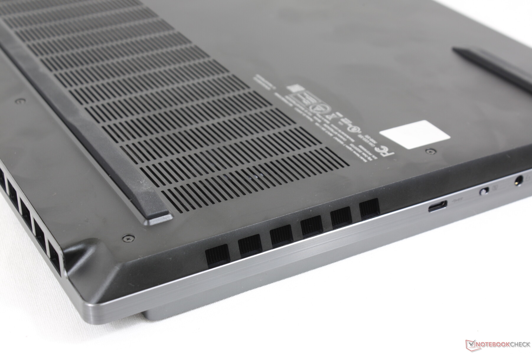 De poortopties zijn gevarieerd en meestal langs de achterrand van het chassis in plaats van de zijkanten. Er zijn vier individuele USB-C poorten, wat meer is dan op de meeste andere gaming laptops. Ze zijn echter niet gelijk geschapen, want alleen bepaalde USB-C-poorten ondersteunen DisplayPort, terwijl een andere mogelijk Power Delivery ondersteunt, zoals blijkt uit onze onderstaande foto's.