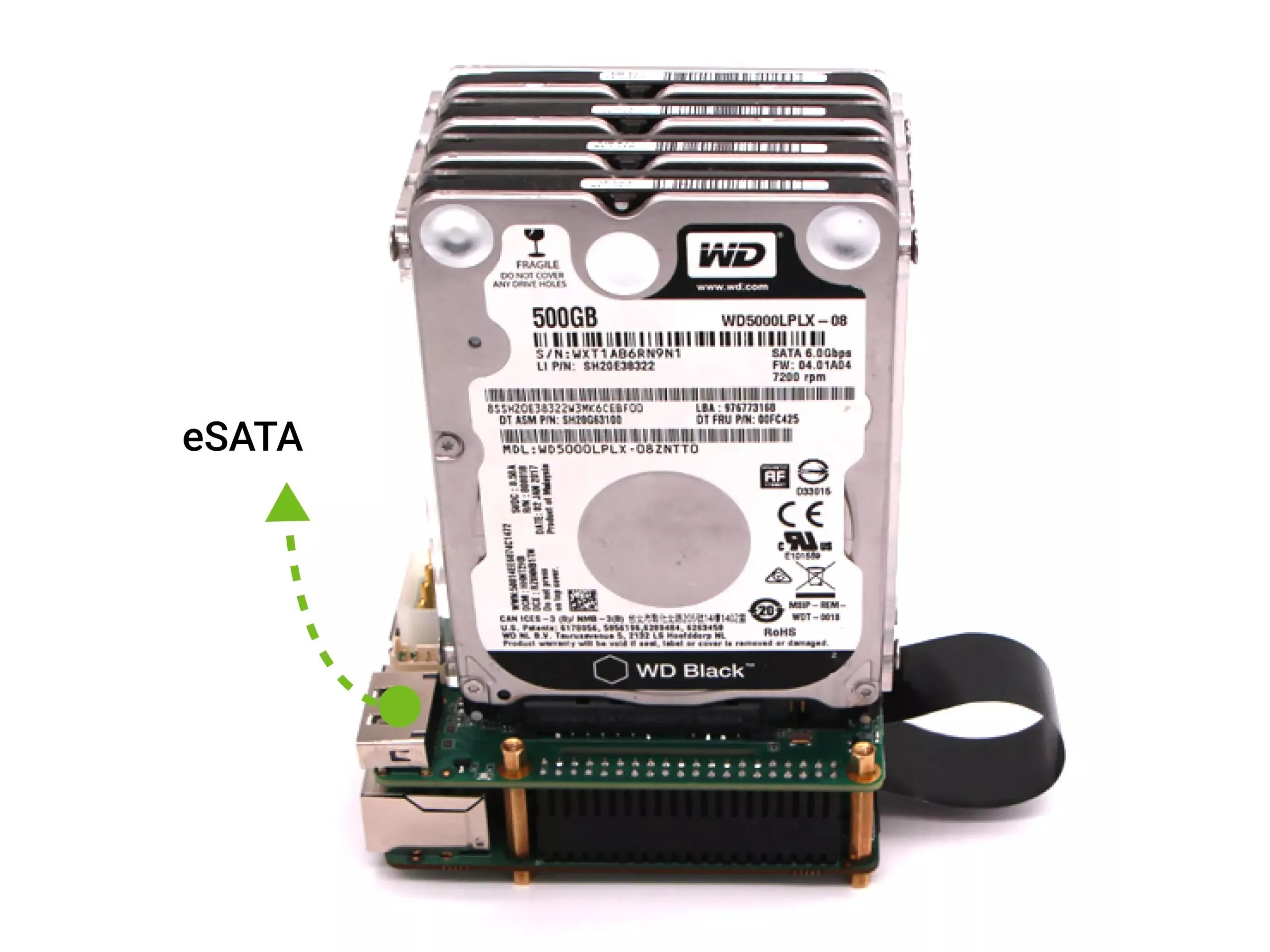 De Radxa Penta SATA HAT is zo'n uitbreidingskaart, die volgens de fabrikant compatibel is met de Raspberry Pi 5, Rock 5A, Rock 3C, Rock 4A en Rock 4B. Technisch gezien is het een systeem dat de PCIe-poorten omzet in SATA-poorten. Er zijn vijf SATA-poorten beschikbaar waarin 2,5 inch of 3,5 inch harde schijven geplaatst kunnen worden. Volgens Radxa kan er tot 100 TB aan opslagruimte worden gebruikt. Er is ook een eSATA-poort aan boord. Met een geschikte behuizing kan een NAS worden geïnstalleerd met alleen het bord, de Penta HAT en de single-board computer, terwijl de SATA- en voedingsaansluitingen ook via een kabel kunnen worden aangesloten.