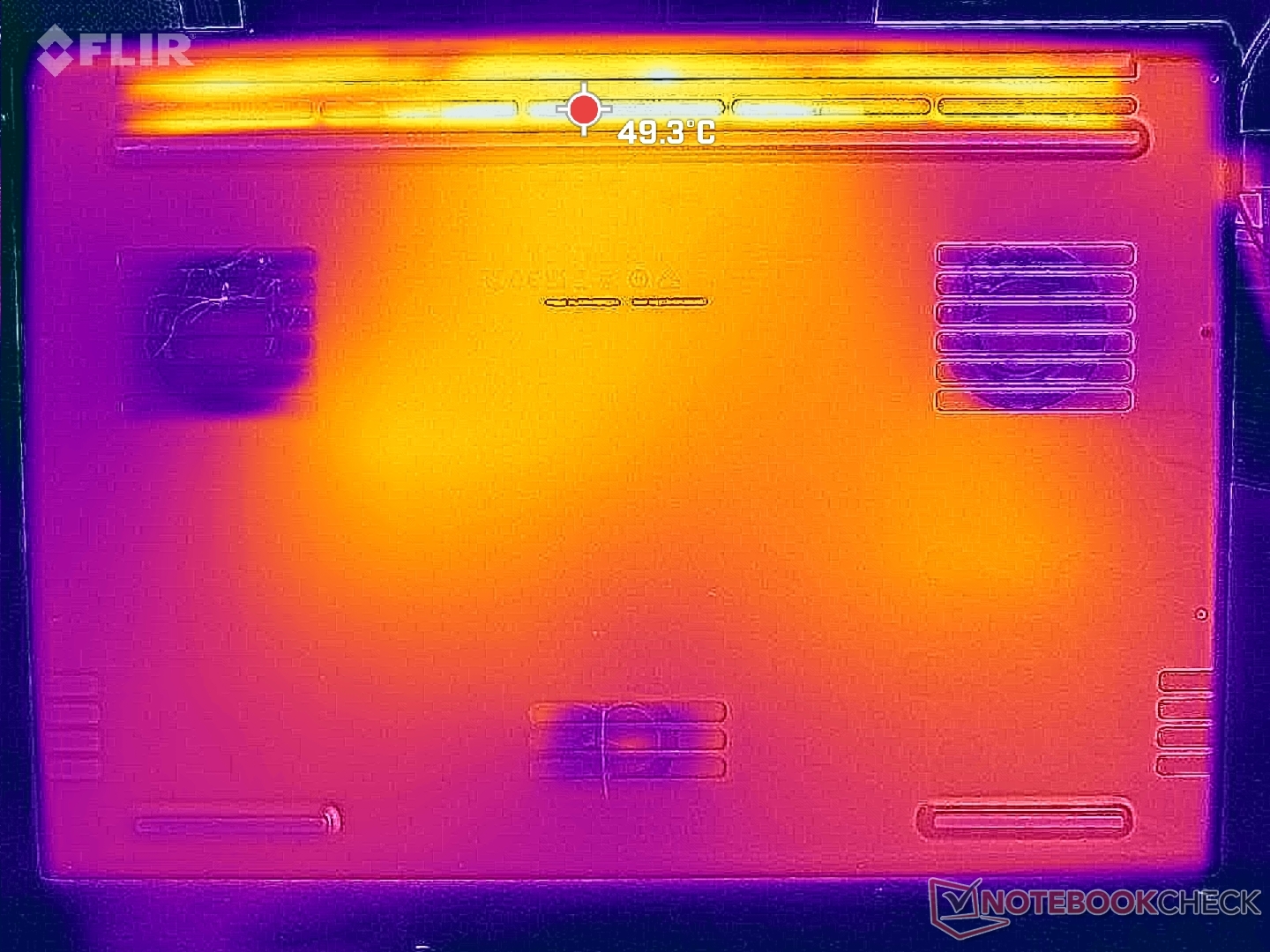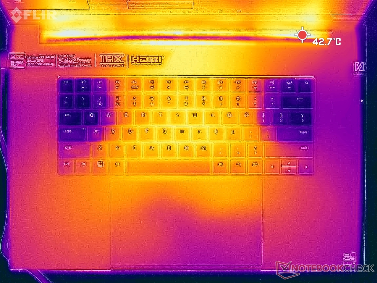 (±) De maximumtemperatuur aan de bovenzijde bedraagt 43.2 °C / 110 F, vergeleken met het gemiddelde van 40.4 °C / 105 F, variërend van 21.2 tot 68.8 °C voor de klasse Gaming.