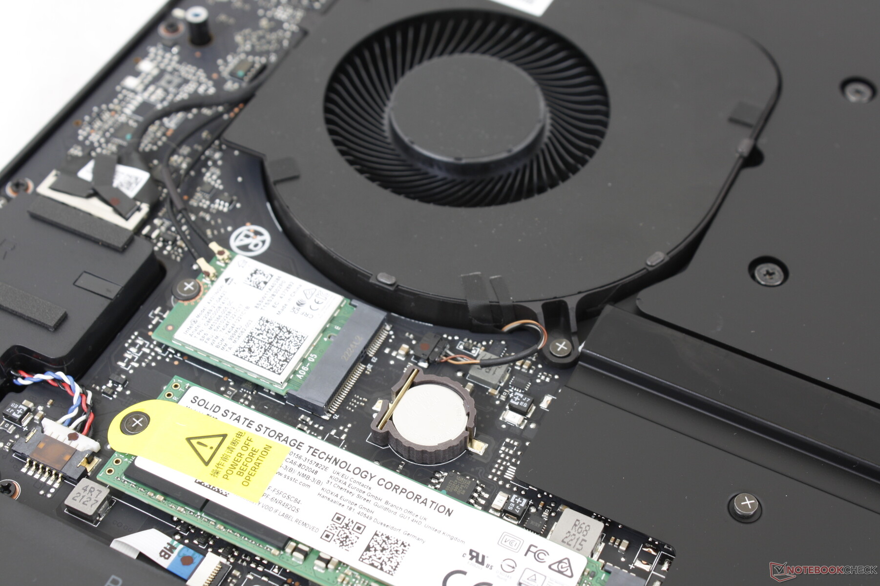 Het onderpaneel wordt vastgezet met tien T5 Torx-schroeven voor eenvoudig onderhoud. Gebruikers hebben directe toegang tot twee M.2 2280 SSD-sleuven, twee SODIMM-sleuven voor maximaal 32 GB DDR5-5600 of 64 GB DDR5-5200, en de verwijderbare WLAN-module. Het meest opvallende is dat het huidige Blade 18-ontwerp een extra ventilator direct onder het clickpad bevat, vergelijkbaar met oudere Blade 17-ontwerpen.