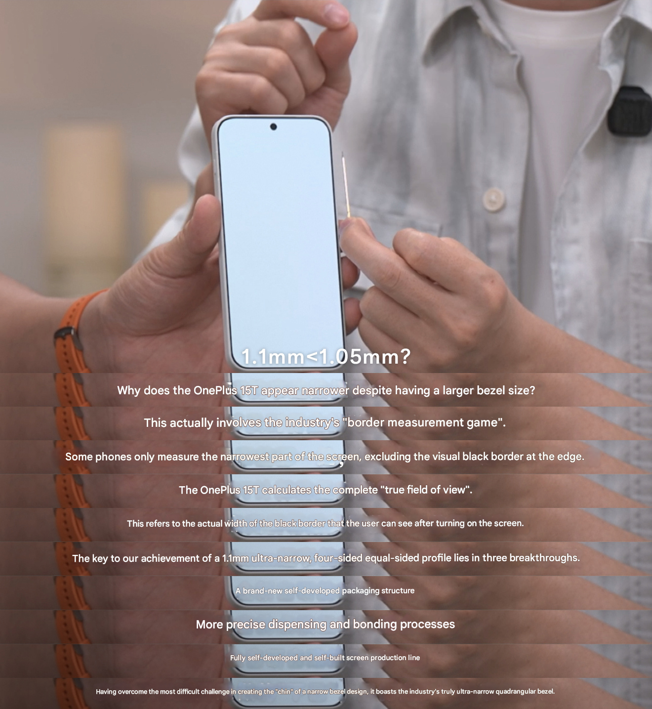 Toen de aandacht verschoof naar de voorkant, vertelde OnePlus over de randen van de smartphone. Ze zijn 1,1 mm dik, maar het merk beweert dat de randen dunner lijken dan een telefoon met 1,05 mm bezels. Dit is het resultaat van een gloednieuwe verpakkingsstructuur, met een "nauwkeuriger doseer- en hechtproces"