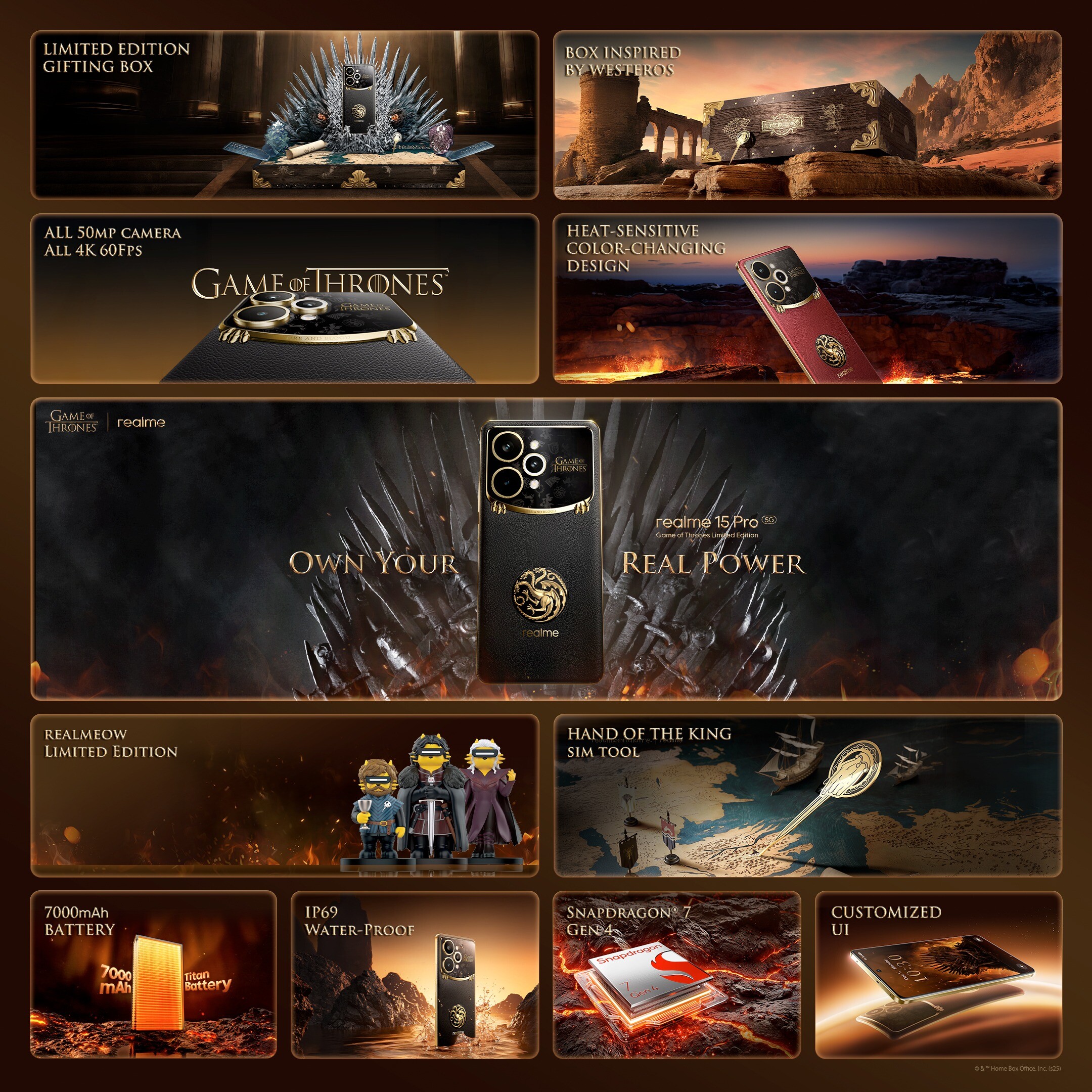 De telefoon zelf heeft een gouden frame, een zwarte leren achterkant, een groot camera-eiland met gouden accenten, drakenpoten en de "Vuur en Bloed" huiswoorden van Huis Targaryen. Op de achterkant van de telefoon staan ook het zegel van Huis Targaryen en het Realme-logo, terwijl de twee grote camerasensoren gedessineerde gouden ringen hebben naast de huiswoorden van Huis Stark en Huis Lannister.