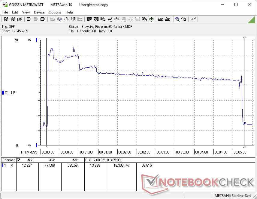 Hoewel we af en toe schommelingen in de kloksnelheden zien, vertoont de Realme Book (Slim) vrij stabiele prestaties onder stress bij de nominale PL1/PL2 limieten zonder significante tekenen van throttling.