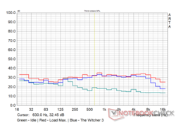 Onder stress worden de maximale temperaturen waargenomen in de linkerboven- en linkeronderhoek van de eenheden. Temperaturen rond het toetsenbord zijn voor het grootste deel acceptabel, terwijl het touchpad en de palmsteun relatief koel blijven. De voeding bereikt echter bijna 50 °C onder belasting.