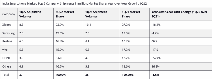 Deze ongekende stijging wordt toegeschreven aan verstoringen en de laatste golf van de wereldwijde pandemie. Als gevolg daarvan zagen alle top-5 merken in het land hun verschepingsvolumes dalen - met één uitzondering Realme's marktaandeel van Realme groeide met 46,3%, met een verkoop van 6 miljoen toestellen tegenover 4,1 miljoen in 1Q2021.