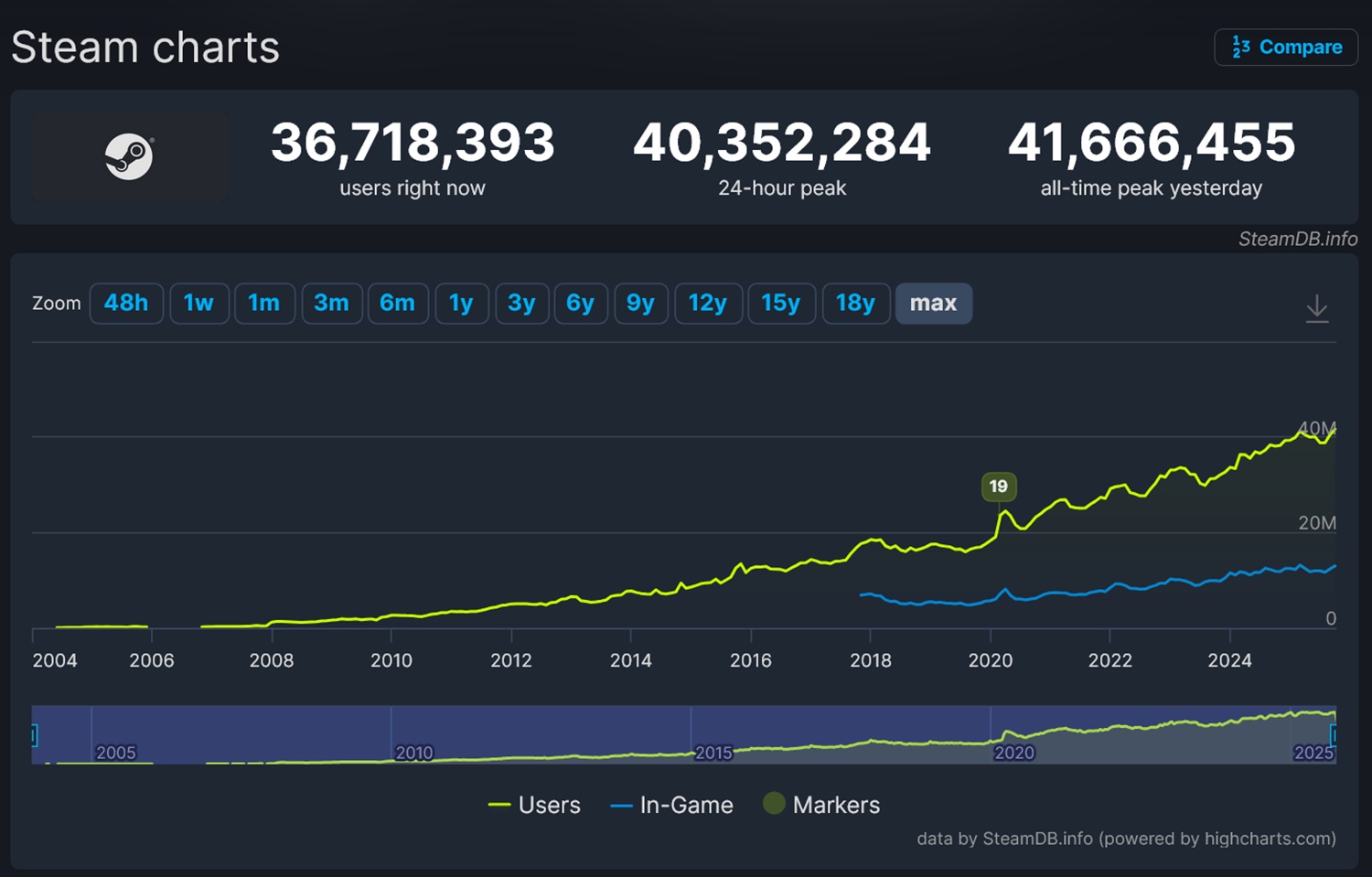 Ondanks de concurrentie van de Epic Games Store en abonnementsdiensten vertoont de dominantie van Steam geen tekenen van vertraging. Het gameplatform voor pc's van Valve vestigde op zondag 12 oktober opnieuw een record voor het hoogste aantal gelijktijdige spelers. Het debuut van populaire Steam-games zoals Battlefield 6 verleidde meer dan 41 miljoen gamers om tegelijkertijd in te loggen.