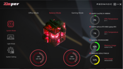 Samen met het verlichte toetsenbord van de laptop zorgen twee LED-elementen voor wat kleur in de mix: De RedMagic letters op het scharnierdeksel en het logo op het deksel schitteren in alle kleuren van de regenboog. Alle elementen kunnen afzonderlijk worden bediend. Het opschrift dient ook als batterij-indicator: een rood knipperend lampje geeft aan dat de batterij bijna leeg is.