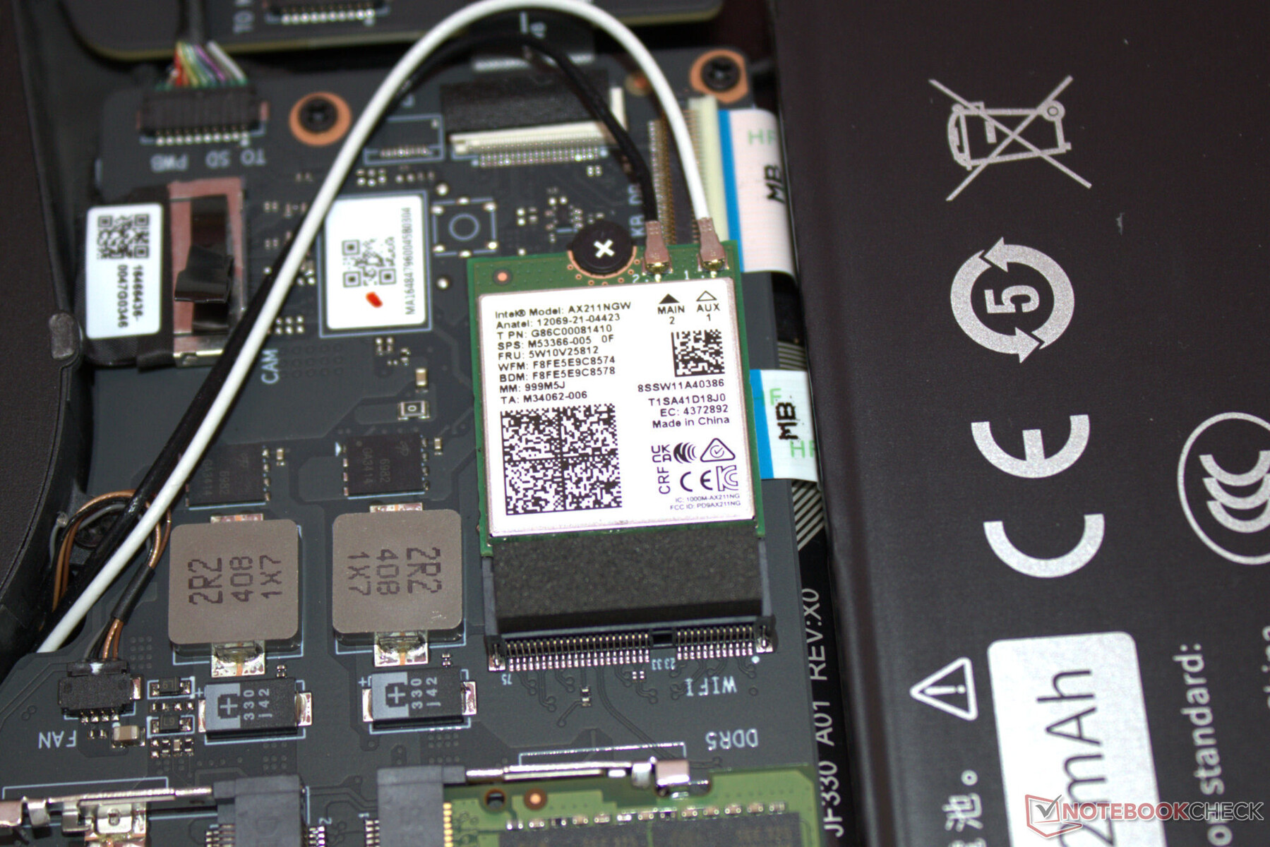 Nadat u alle schroeven aan de onderkant van de behuizing hebt verwijderd, kunt u het onderste kastdeel verwijderen met behulp van een plectrum of een platte spatel. Vervolgens hebt u toegang tot de geheugenbanken (waarvan er één bezet is), SSD (PCIe 4, M.2-2280), tweede SSD-sleuf (PCIe 4, M.2-2280) WLAN-module, BIOS-batterij, ventilatoren en de batterij.