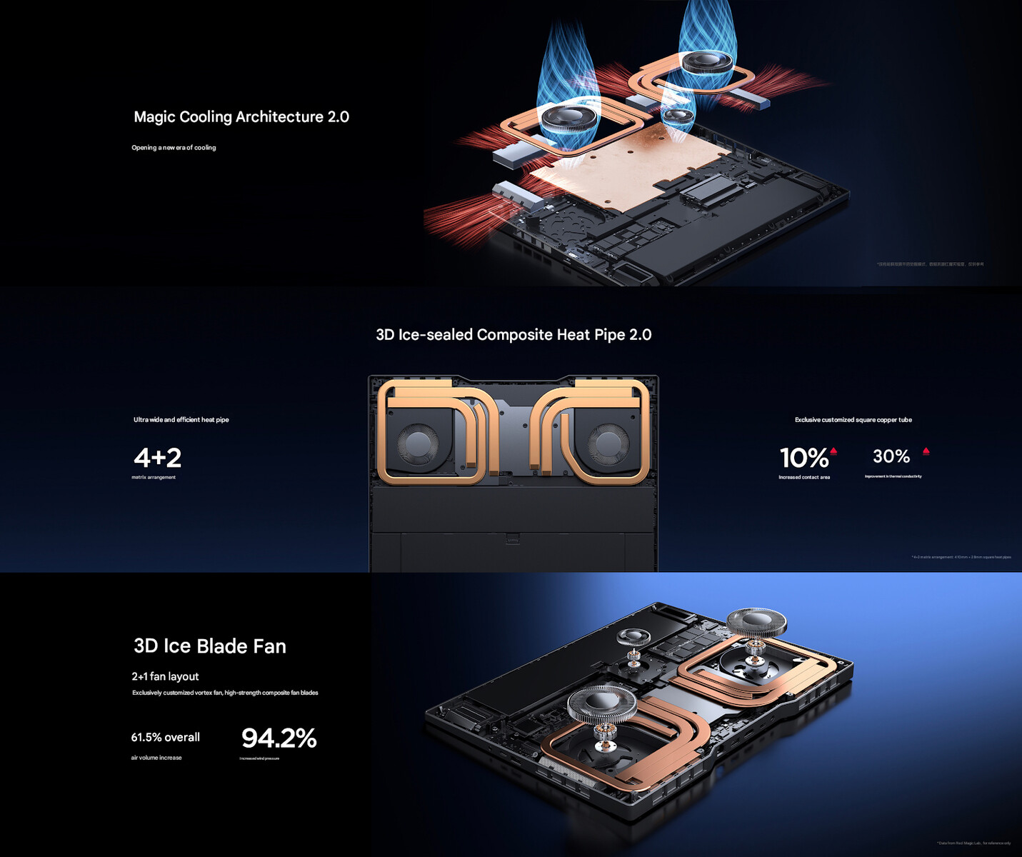 Er is nog een andere optie met de RTX 5080, een capabele high-end laptop GPU. RedMagic benadrukt dat de CPU en GPU zijn gekoppeld aan de Magic Cooling Architecture 2.0, waarvan gezegd wordt dat deze het systeem koel houdt tijdens zware belasting. Er wordt beweerd dat het ontwerp een hogere luchtstroom mogelijk maakt dan de voorganger, en er zijn in totaal drie actieve ventilatoren.