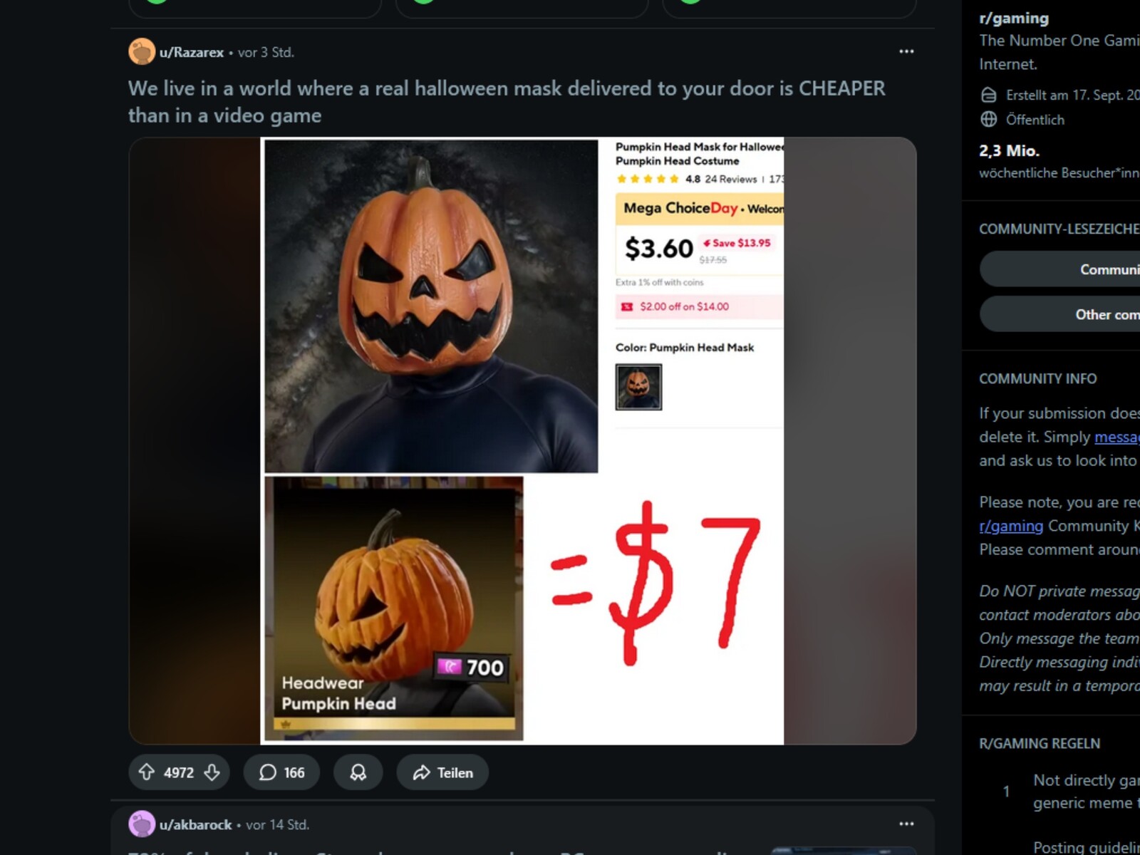 Op 4 november ging een bericht op Reddit met de titel "We leven in een wereld waar een echt Halloweenmasker dat bij u thuis wordt afgeleverd goedkoper is dan een masker uit een videogame" viraal. In de post werd erop gewezen dat een pompoenhoofdmasker in Fortnite twee keer zoveel kost als een vergelijkbare echte versie. Het opvallende prijsverschil trok al snel de aandacht en leidde binnen drie uur tot ongeveer 5.500 reacties.