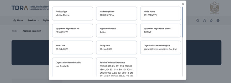Zoals de screenshot hieronder laat zien, heeft Xiaomi de Redmi A7 Pro gecertificeerd bij de Telecommunications and Digital Government Regulatory Authority (TDRA). De TDRA, een regelgevende instantie in de VAE, koppelt de naam 'Redmi A7 Pro' aan het modelnummer 25128RN17Y, waarvan 25128RN17 de stam is. Helaas gaat de TDRA niet verder in op de hardwarespecificaties.