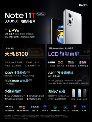 Andere kenmerken van de Redmi Note 11T Pro zijn een 5080 mAh batterij, 67 W opladen, stereo speakers, Bluetooth 5.3 ondersteuning, een 3,5 mm jack, en IP53 certificering. De telefoon is beschikbaar in configuraties van 6/128 GB, 8/128 GB en 8/256 GB en kost respectievelijk CNY 1699 (US$255), CNY 1899 (US$285) en CNY 2099 (US$305).
