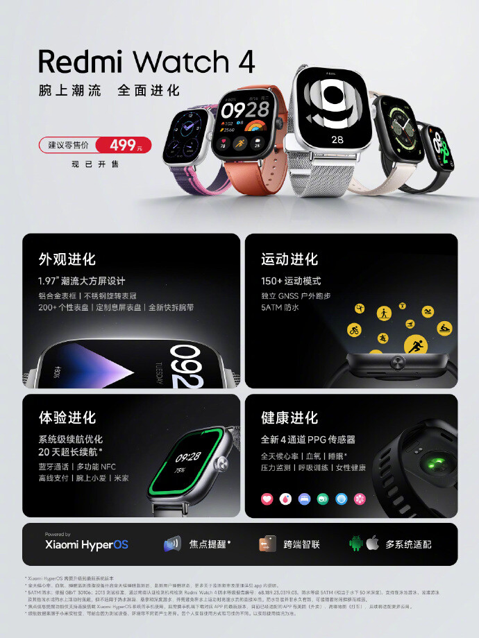 Xiaomi heeft de Redmi Watch 4 ook uitgerust met Bluetooth 5.3 en NFC-mogelijkheden, evenals meer dan 150 sportmodi en sensoren om belangrijke gezondheidsgegevens bij te houden. Net als deWatch S3heeft Xiaomi HyperOS voorgeïnstalleerd, het eigen besturingssysteem dat ook te vinden is in de Redmi K70 en Xiaomi 14-serie. De Redmi Watch 4 wordt in China verkocht voor CNY 499 (~US$ 70), waarmee hij onder de prijs van deWatch S3met CNY 300 (~US$42).