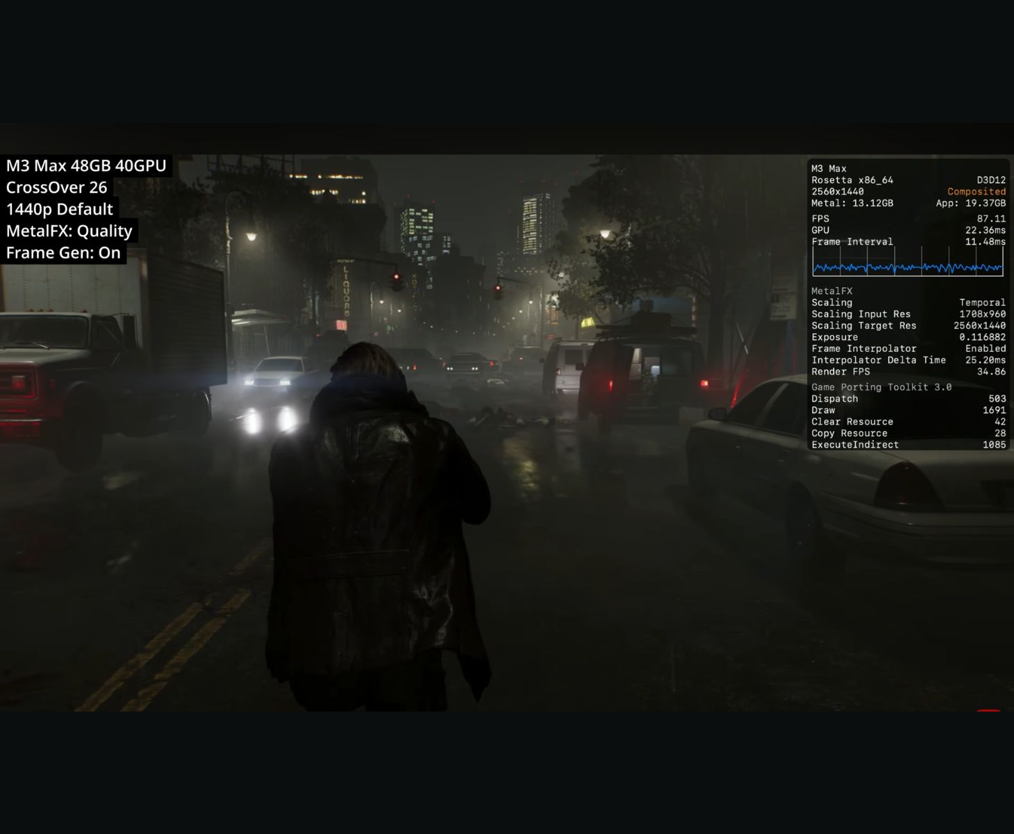 Nieuwere machines doen het veel beter. Het spel werd uitgevoerd op een M3 Max MacBook Pro met 48 GB verenigd geheugen en een 40-core GPU via CrossOver 26. Op native 1080p met standaard grafische instellingen, MetalFX uitgeschakeld en framegeneratie uitgeschakeld, hield het systeem ongeveer 70 FPS in een open straatscène, wat aantoont dat de hardware het spel comfortabel aankan zonder te hoeven upscalen. De overlay laat ook zien dat de titel door Apple's Game Porting Toolkit laag loopt met frametijden van ongeveer 14 ms, terwijl er ongeveer 10,5 GB GPU-geheugen wordt gebruikt.