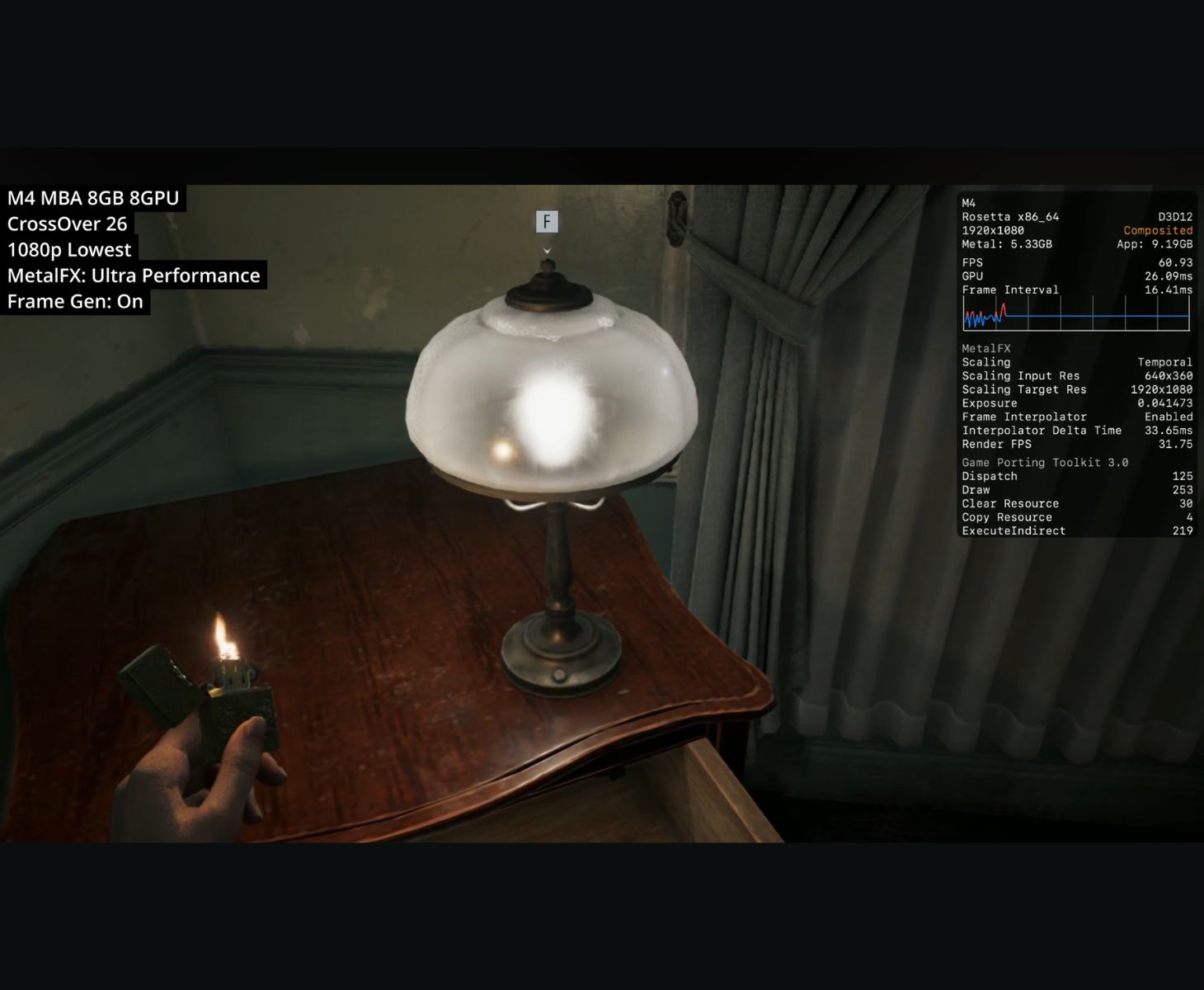 Op de meer betaalbare MacBook Air met de M4-chipkan het spel nog steeds draaien met enkele aanpassingen. Het spel werd ingesteld op 1080p met de laagste grafische voorinstelling, terwijl MetalFX Ultra Performance upscaling en framegeneratie waren ingeschakeld. In deze configuratie haalt het spel ongeveer 60 FPS, met frametijden van bijna 16 ms. De overlay toont ook een render-FPS van ruwweg 31-32 FPS, wat aangeeft dat framegeneratie de uiteindelijke framerate helpt verbeteren. Het GPU-geheugengebruik ligt rond de 5,3 GB, terwijl het applicatiegeheugen ongeveer 9,1 GB is.