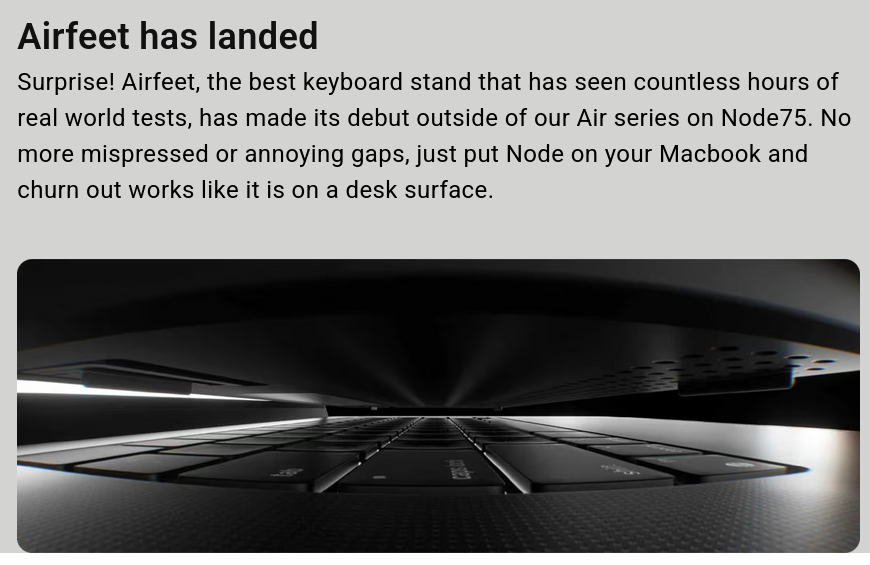 De NuPhy Node75 zal ook dezelfde voetjes hebben waarmee toetsenborden zoals de Air-serie bovenop een standaard Apple MacBook-toetsenbord kunnen worden geplaatst zonder de ingebouwde toetsen van het laptoptoetsenbord te bedienen.