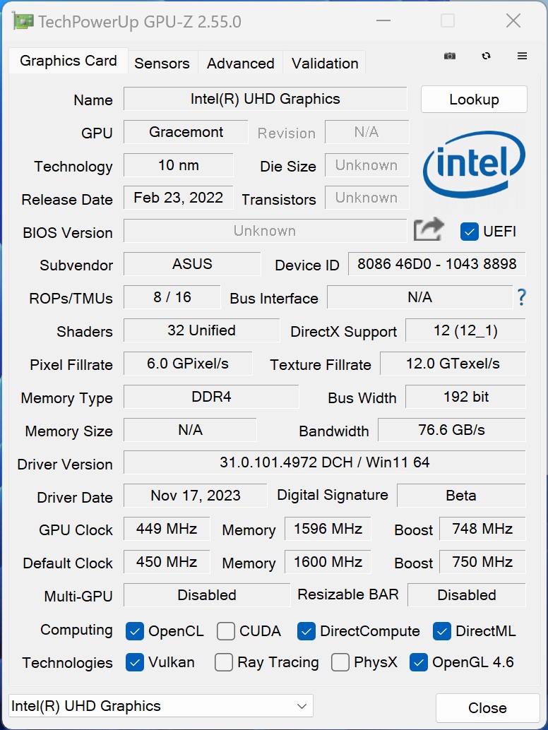 De Intel N200-processor's Intel UHD Graphics is een eenvoudige iGPU met 32 EU's. In directe vergelijking met de concurrentie kan de Asus ExpertCenter PN42 het in dit opzicht een stuk beter bijbenen. Asus had zeker wat meer prestaties uit de iGPU kunnen persen door DDR5 te gebruiken. Toch zou u in de praktijk waarschijnlijk geen extra voordeel merken.