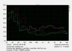 In rusttoestand zijn de huidige Intel chips moeilijk te verslaan. Hier varieert de stroomopname voor het grootste deel van 2,9 W tot 8,7 W. Dit is de reden waarom de laptop koel aanvoelt. Onder belasting ziet de situatie er heel anders uit, maar zelfs hier zijn de oppervlaktetemperaturen nooit kritiek (rond de 40 °C/104 °F in de bovenste gedeelten van het toetsenbord). De onderzijde wordt nooit heet (deze is zelfs koeler dan de bovenzijde). We zien dat LG voor een bescheiden koeloplossing is gegaan. Om echter te voorkomen dat de laptop oververhit raakt en veel geluid produceert, heeft LG besloten om lage vermogenslimieten in te stellen. Dit is geen onredelijk compromis voor een ultra-mobiel apparaat.
