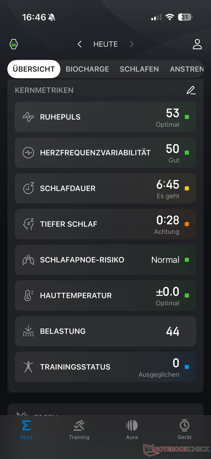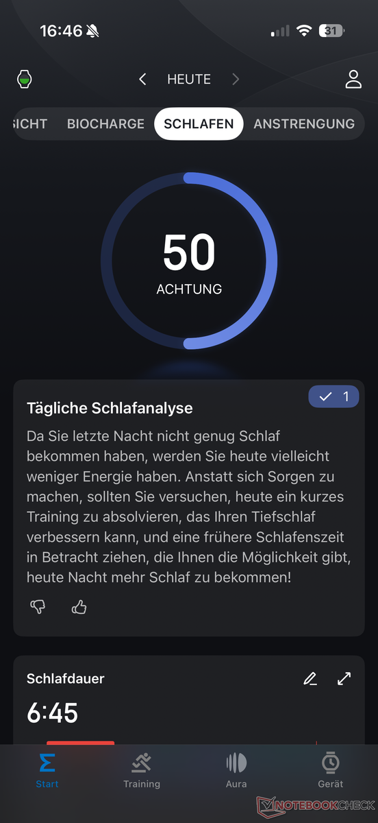 Een kort overzicht van de vorige nacht kan direct op het horloge worden bekeken. Net als bij veel andere functies wordt er een gedetailleerde analyse gegeven in de Zepp app. Terwijl wekelijkse en maandelijkse trends gratis toegankelijk zijn, kunnen sommige AI-functies, zoals u helpen in slaap te vallen met geluiden die aangepast zijn aan uw hartslag, alleen gebruikt worden met het betaalde Aura-abonnement.