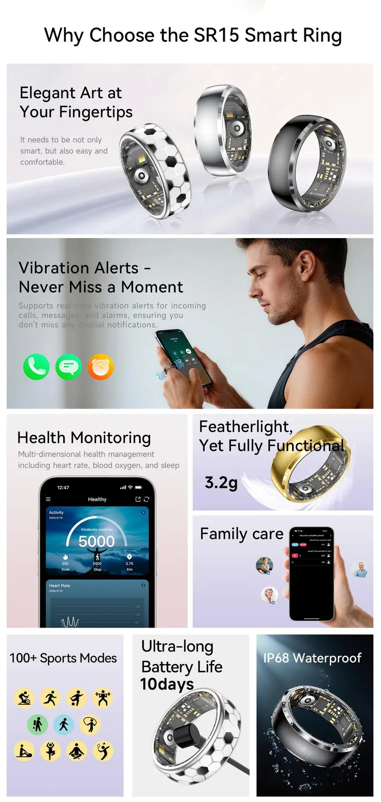 De SR15 heeft verschillende interactieve functies. Een ingebouwde vibratiemotor geeft haptische waarschuwingen voor inkomende oproepen, berichten en alarmen direct op de vinger. Gebruikers kunnen ook gebarenbesturing gebruiken, zoals dubbel tikken, om door muziek, e-books of korte video's op een gekoppelde smartphone te navigeren. Compatibiliteit omvat Android 9.0 en iOS 10.0 of latere versies.