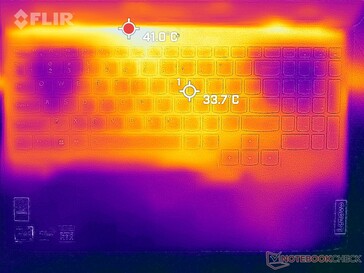 De oppervlaktetemperaturen zijn het warmst in de buurt van het midden van het toetsenbord, terwijl de WASD- en numpad-toetsen veel koeler zijn omdat er frisse lucht door deze toetsen wordt getrokken, zoals blijkt uit de temperatuurkaarten hieronder. Dit is beter dan op de oudere IdeaPad Gaming 3i 15IMH05 ofDell G15 5510 die in vergelijking warmere WASD-toetsen hebben. De hotspot van het toetsenbord kan oplopen tot 43 C tijdens het gamen, wat nog steeds vergelijkbaar is met de hotspots op de eerder genoemde IdeaPad en Dell G15.