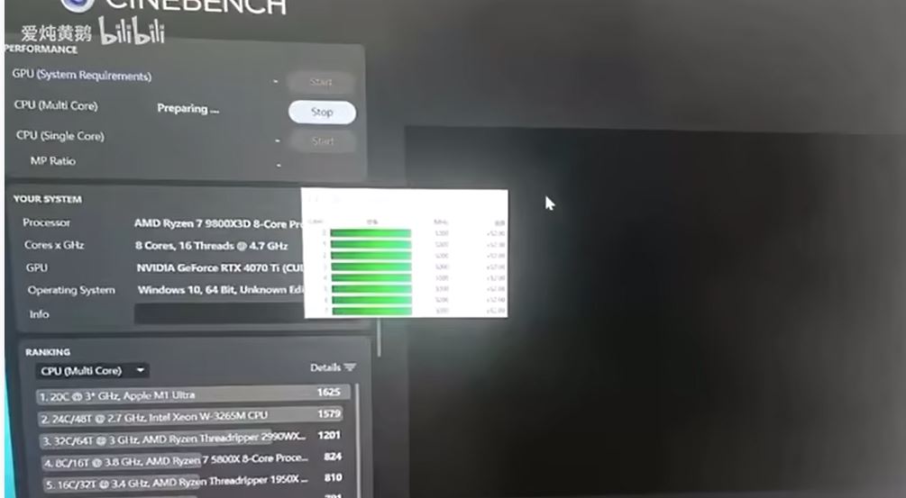 Wat de Ryzen 9000X3D specificaties betreft, gaan er geruchten dat de chips hogere klokfrequenties zullen hebben dan hun Zen 4 tegenhangers. In lijn met deze berichten laat een nieuwe video, geplaatst op bilibili te zien dat de Ryzen 7 9800X3D draait met een veel hogere all-core boostklok dan de Ryzen 7 7800X3D.